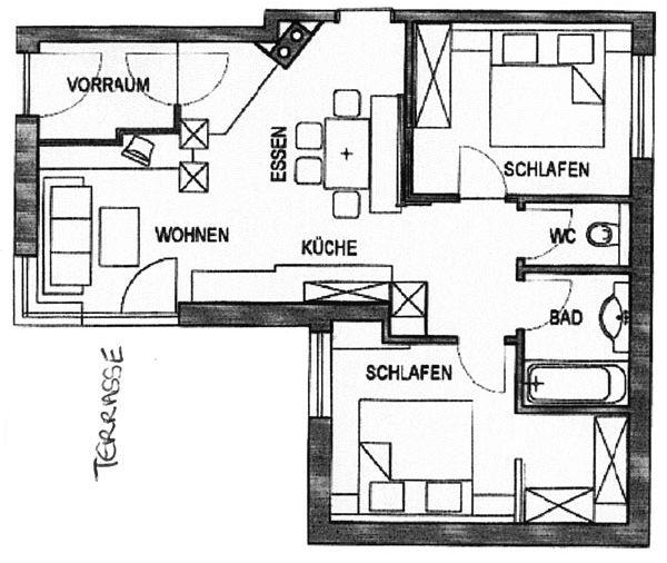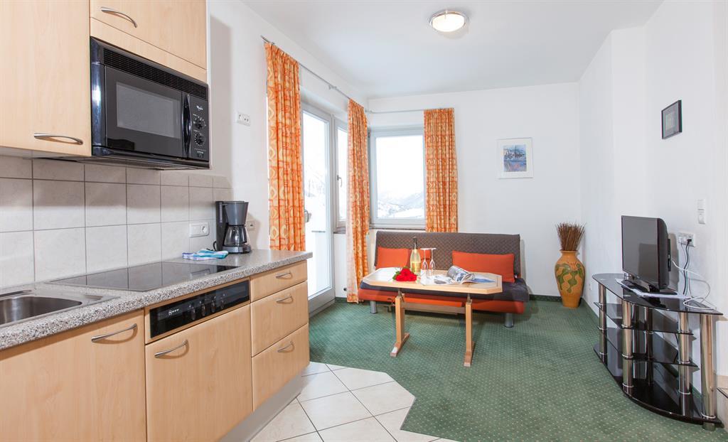 Appartement Top 1 im Parterre mit ca. 66 m²: 2 getrennten Doppelzimmer, 1 Badezimmer mit Badewanne, separates WC, Wohnküche mit Küchenblock (Kaffeemaschine, Cerankochfeld, Geschirrspüler uvm.) und einer gemütlichen Sitzecke (Schlafmöglichkeit für 2 weitere Personen). Genießen Sie die Bergkulisse auf der Terrasse. Appartement Top 1 kann mit Top 2 zusammengeschlossen werden.