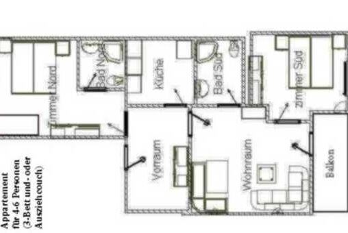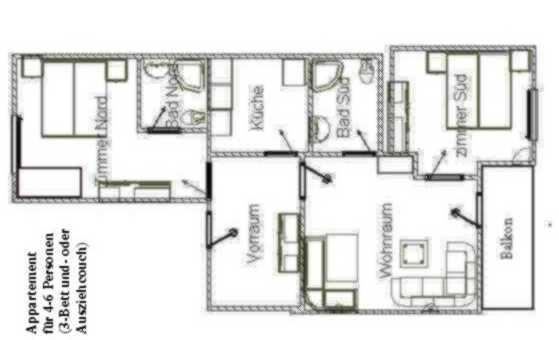 Appartement mit 1 Dreibett- und 1 Doppelzimmer, Wohnraum (mit Ausziehcouch), separate Küche, 2x Dusche/WC, Balkon und TV, W-Lan Internet incl. Größe ca 68 m².