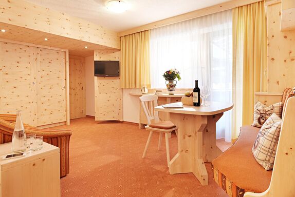 Viel, viel Freiraum für bis zu 4 Personen. Ca. 48 m2 große Wohneinheit mit großzügigem, in massivem Zirbenholz gestaltetem Schlafzimmer und einer großen Zirbenstube mit Sitzecke und extrabreitem Sofa. Dusche/WC getrennt, Balkon, Flat-TVs in jedem Raum, Highspeed-WLAN, Radio, Safe, Fön und einer Cremesso Kaffeemaschine mit Kaffee zur freien Entnahme.