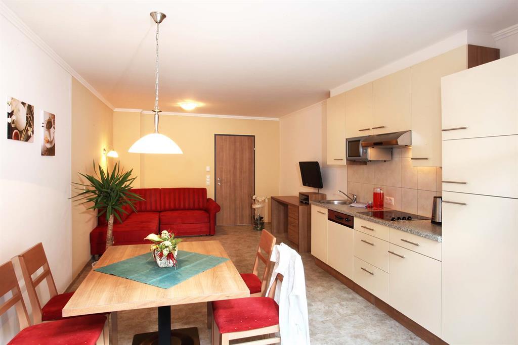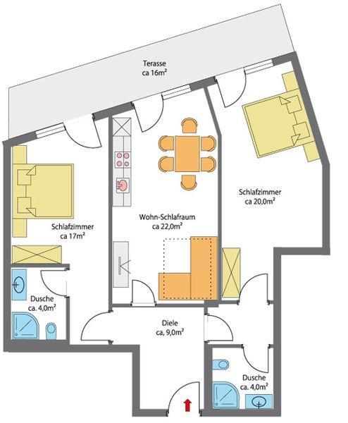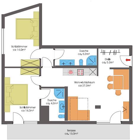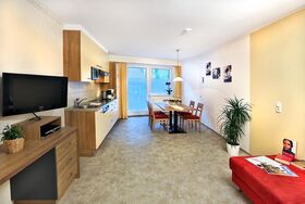 3 Zimmer-Wohnung, ca. 62-75 m², 2 Doppelzimmer mit jeweils Dusche/WC, Flur mit Garderobe, gemütliche Wohnküche mit Ausziehcouch (Schlafmöglichkeit für 2 Personen), Essecke mit Küchenblock (Ceranfeld, Dunstabzug, Kühl-Gefrierschrank, Mikrowelle, Geschirrspüler, Kaffeemaschine, Wasserkocher, Toaster,...), 3x Digital-Flat-TV, Balkon, Aufzug