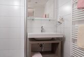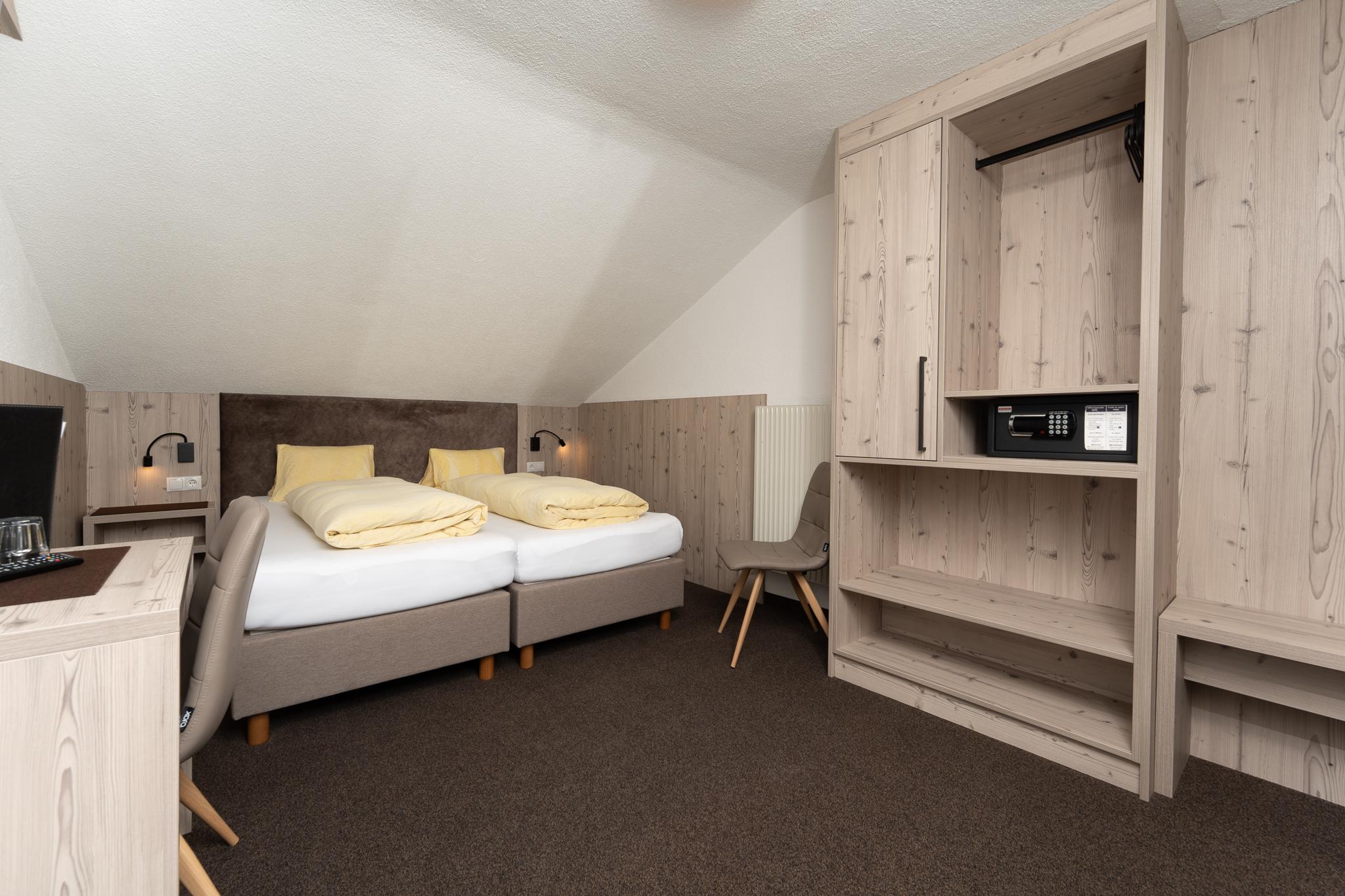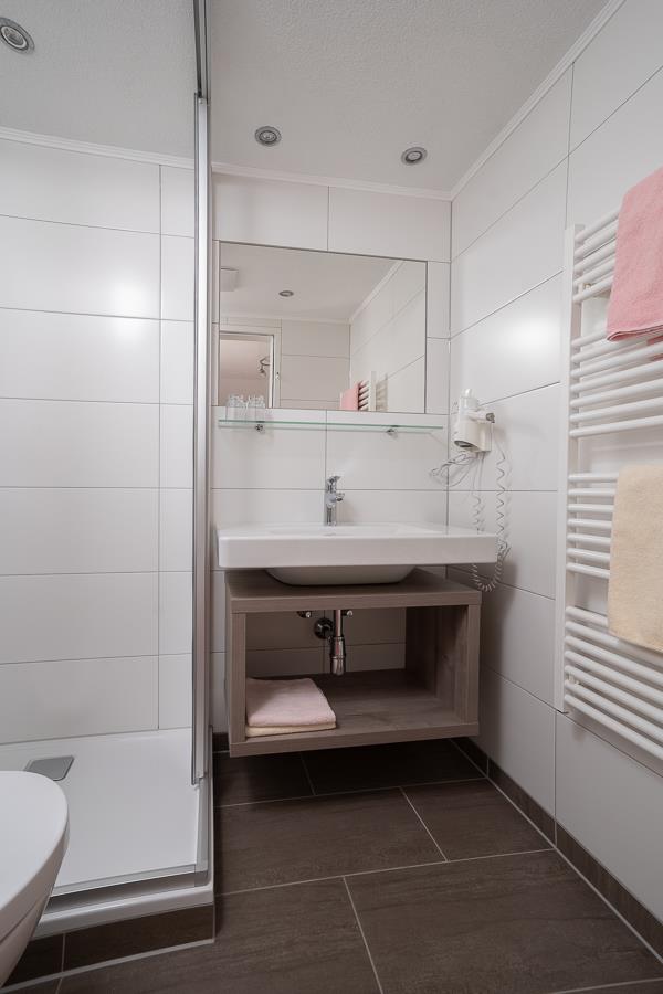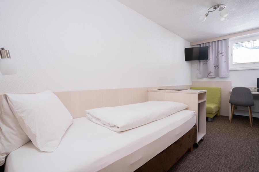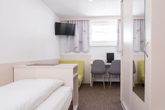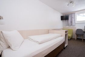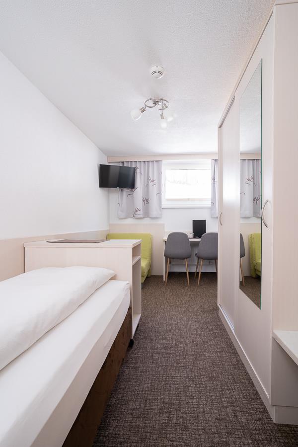 Einzelzimmer mit Badezimmer (Dusche/WC), Kabel-TV (Flatscreen), Sitzgelegenheit, Safe und Föhn. Ca. 11 m².