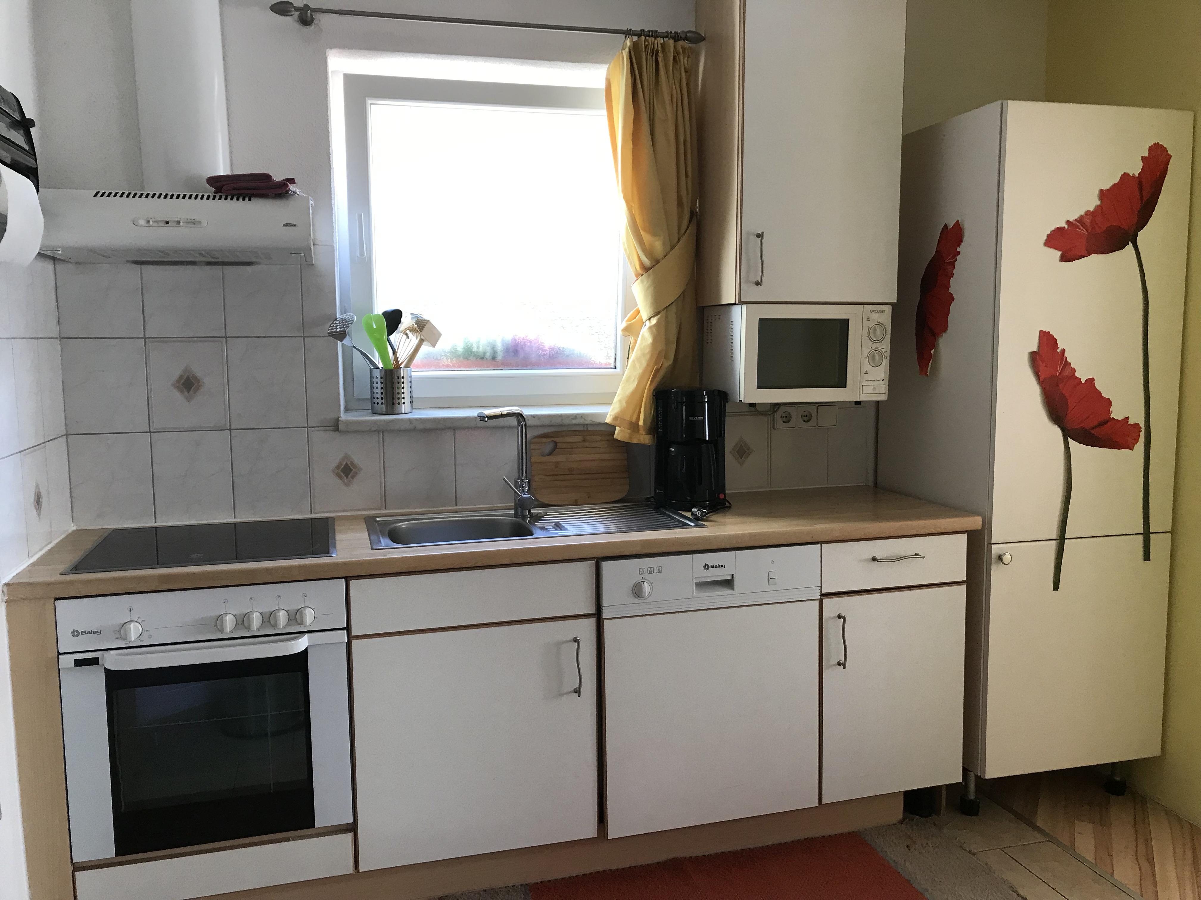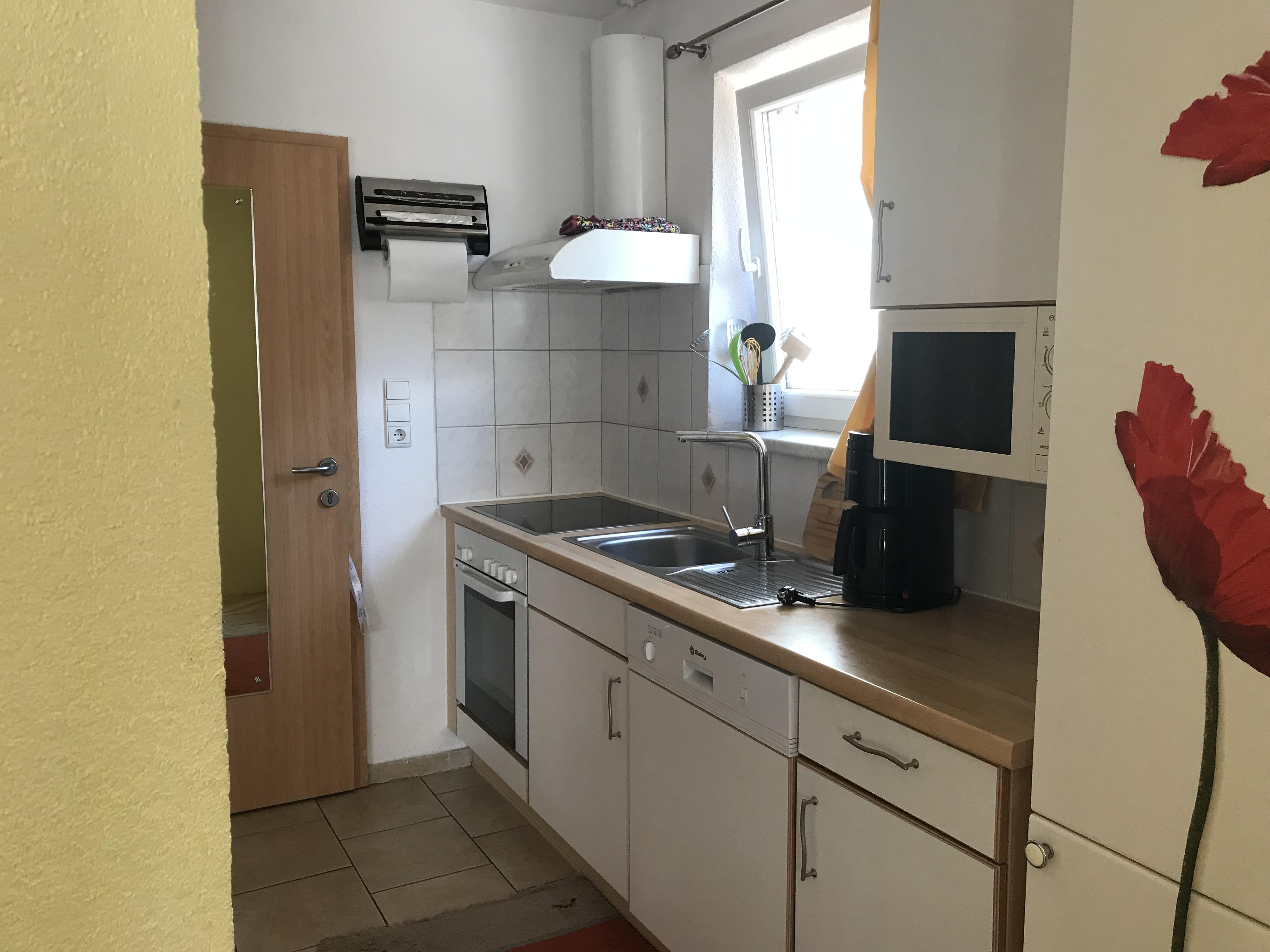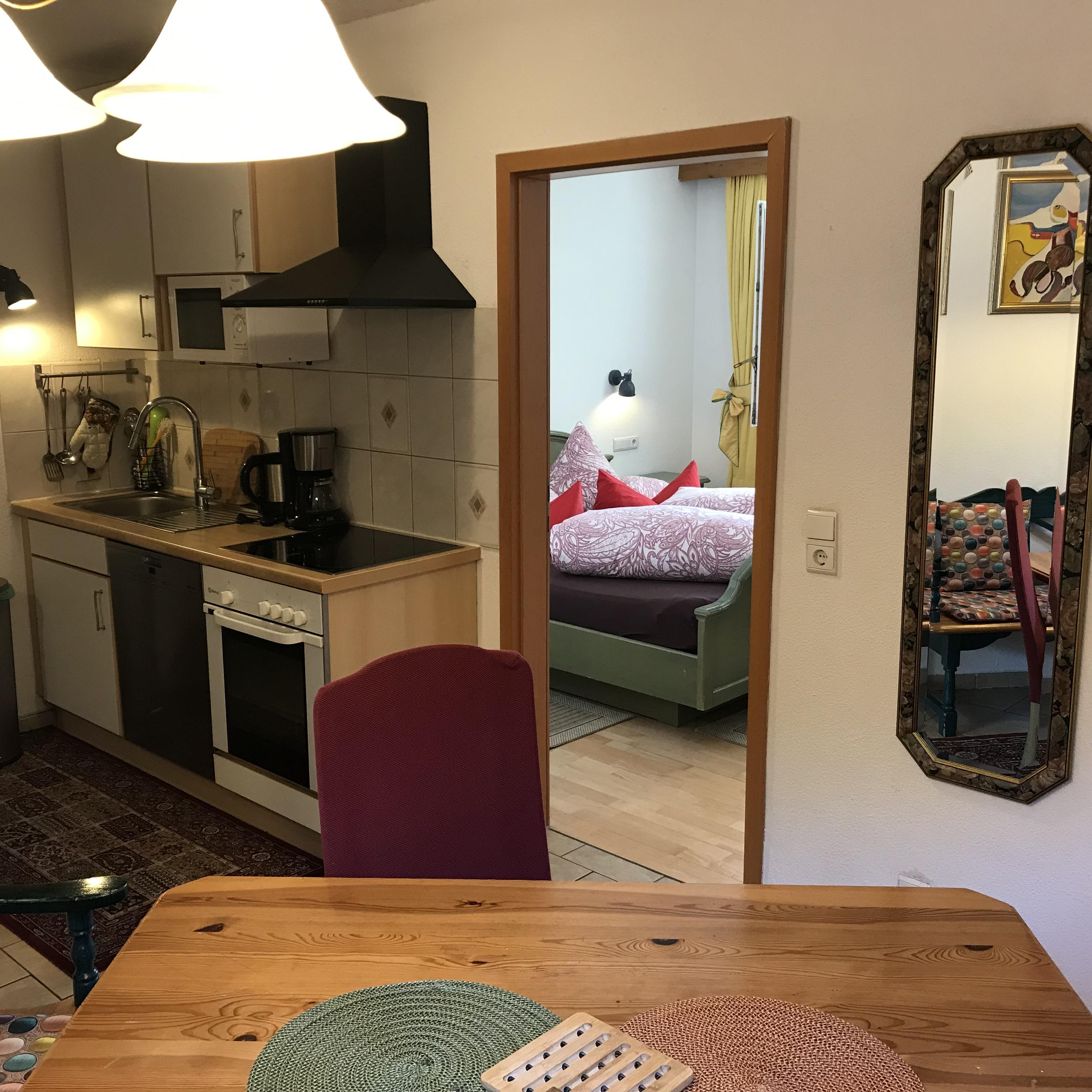 Ferienwohnung(50m² EG)mit zwei Schlafzimmer, Esszimmer,Einbauküche(Backofen,Cerrankochfeld,Geschirrspüler,Kühlschrank mit Gefrierplatz,Kaffeemaschine),Dusche/WC,Safe,Sat/TV/DVD u. Internetanschluss,sonnige Terrasse,Parkplatz vor der Tür