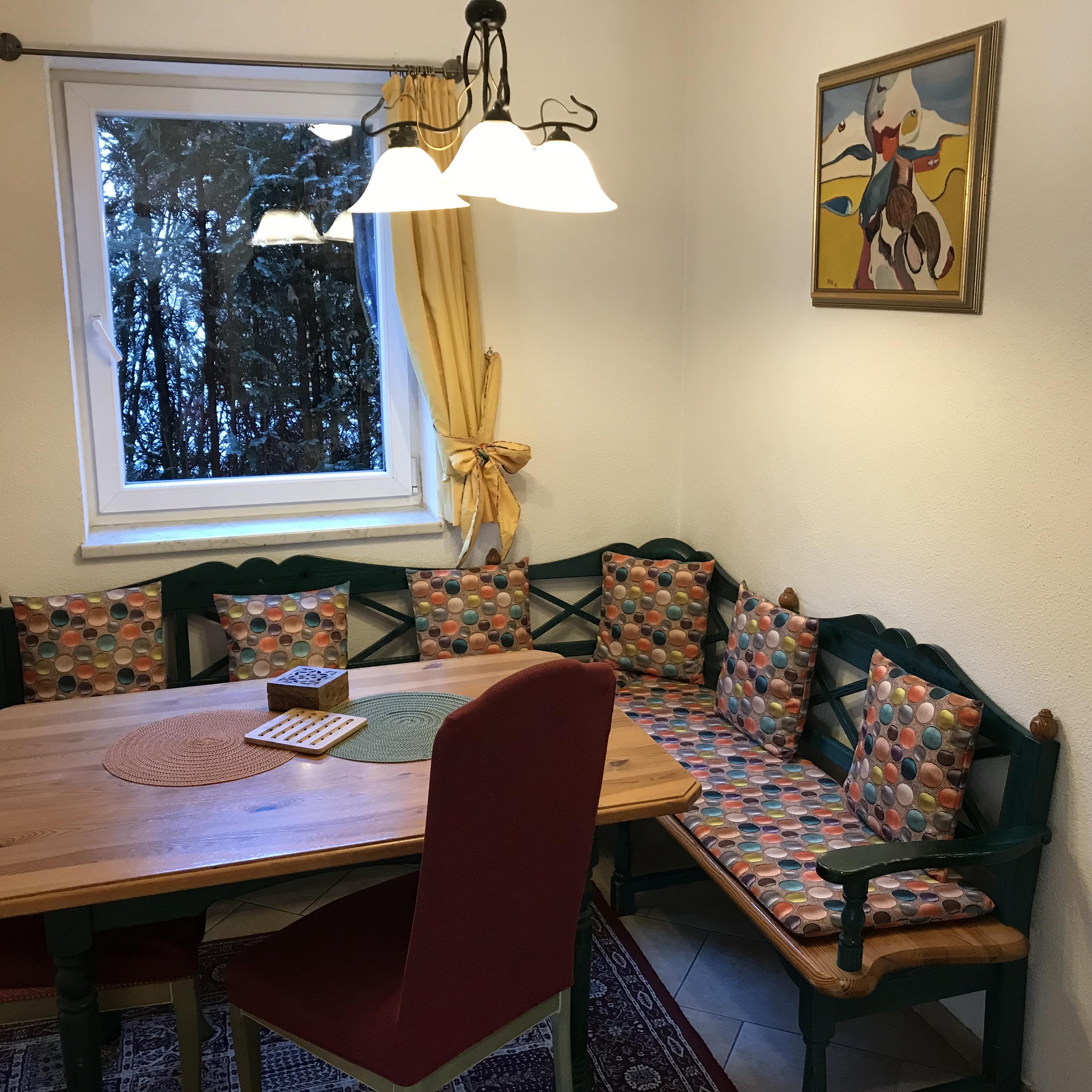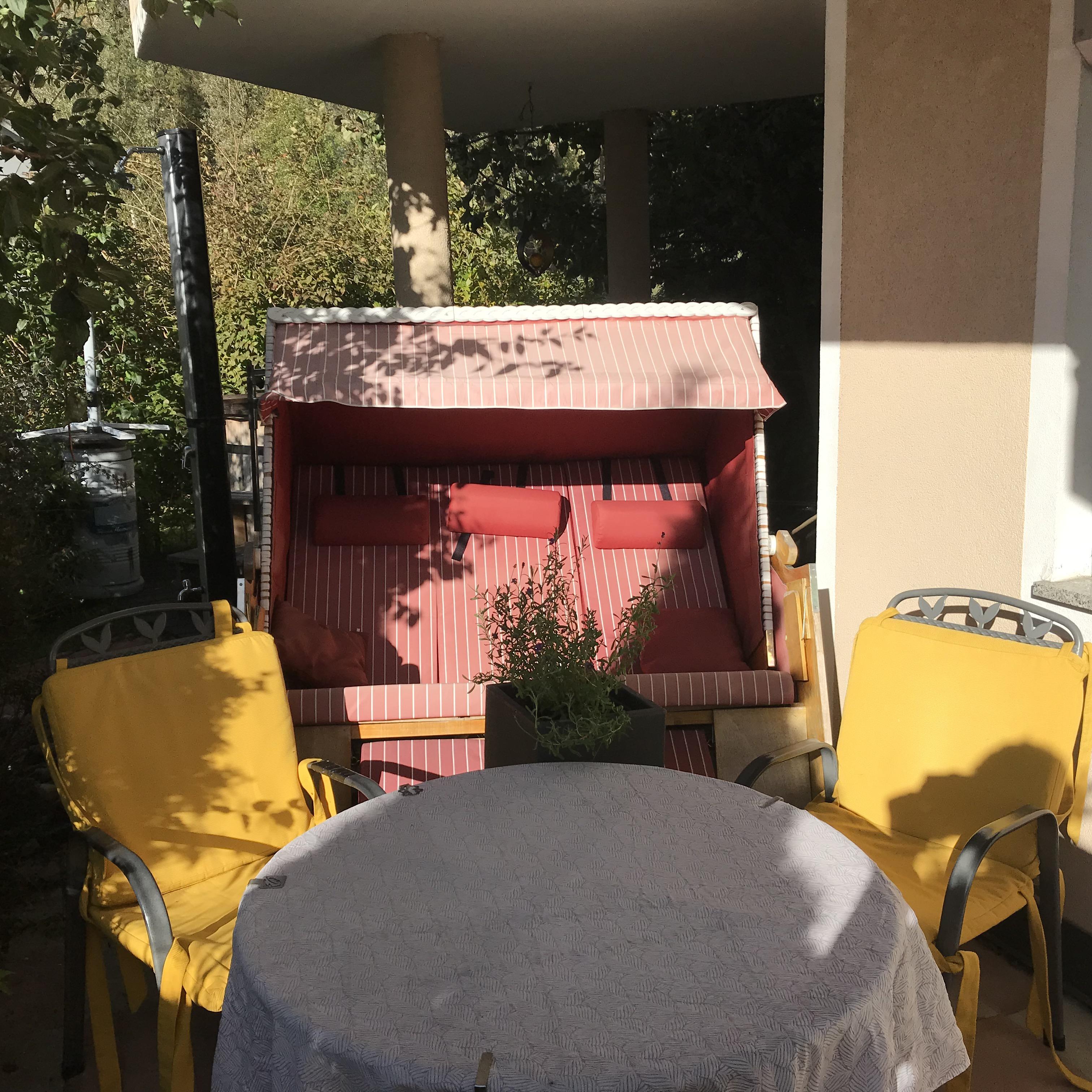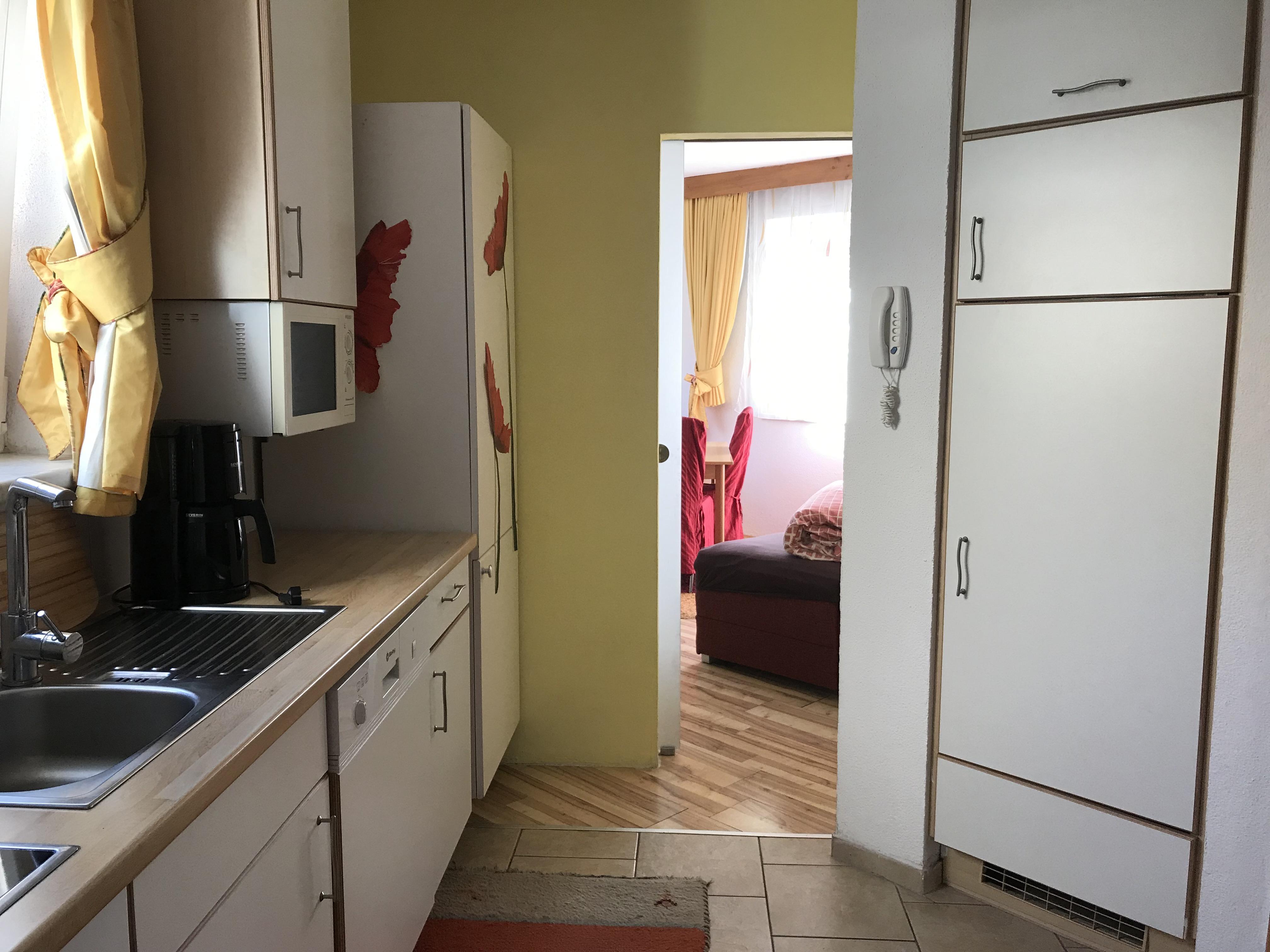 Ferienwohnung(50m² EG)mit zwei Schlafzimmer, Esszimmer,Einbauküche(Backofen,Cerrankochfeld,Geschirrspüler,Kühlschrank mit Gefrierplatz,Kaffeemaschine),Dusche/WC,Safe,Sat/TV/DVD u. Internetanschluss,sonnige Terrasse,Parkplatz vor der Tür