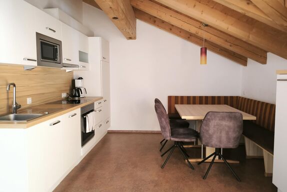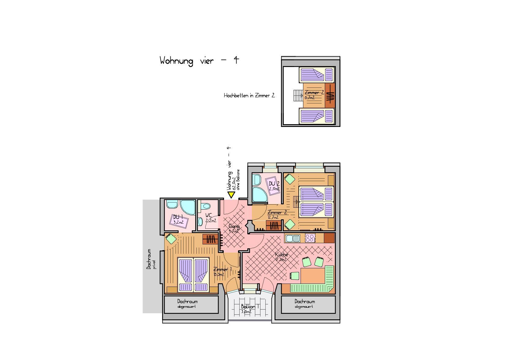 Appartement für 4 - 6 Personen: 1 Doppelzimmer mit Dusche und Balkon, 1 Vierbettzimmer mit Dusche, ein getrenntes WC, Gang mit Garderobe, Küche (4-Platten-E-Herd, Dunstabzug, Kühlschrank mit Gefrierfach, Spülmaschine mit Tabs, Mikrowellengerät, Kaffeemaschine, Wasserkocher, Kochgeschirr/-utensilien, Essgeschirr mit Besteck und Geschirrtüchern) mit Esstisch und Balkon. Ca. 63 m²