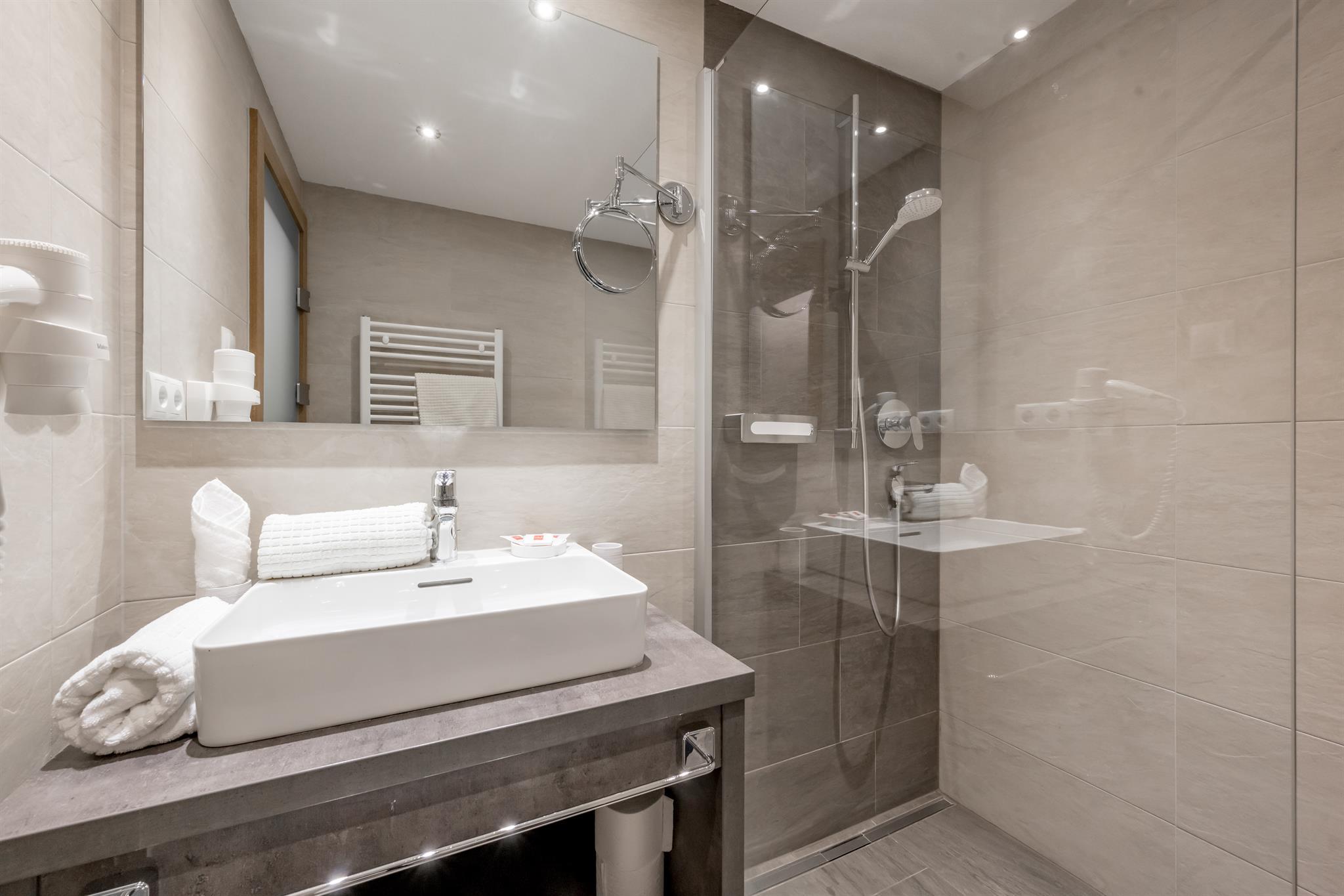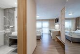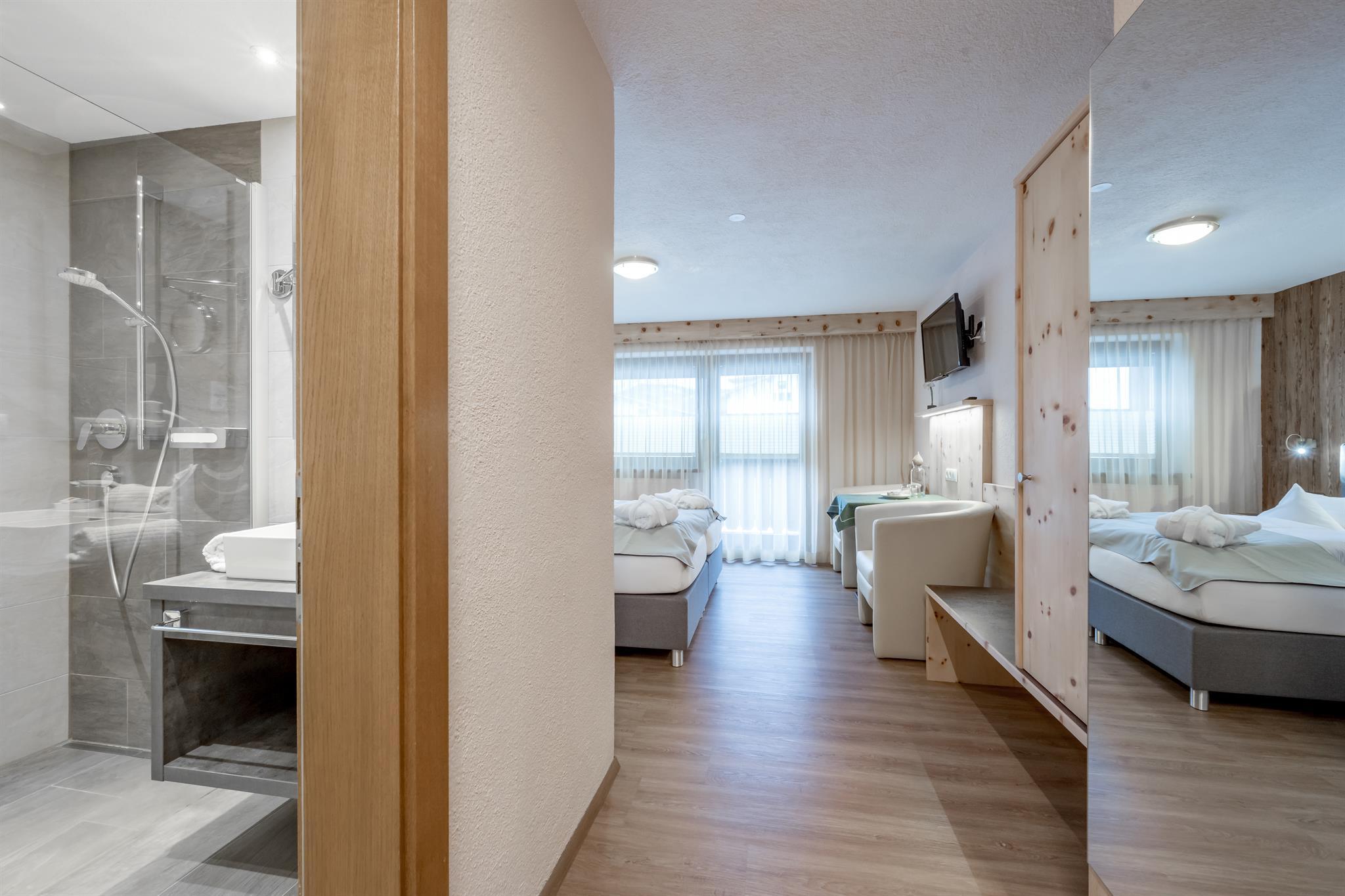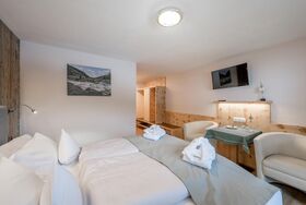 3 Doppelzimmer jeweils mit Dusche/WC im Zimmer, Bettwäsche, Handtücher,Haarföhn, Pflegeprodukte, TV, Südbalkon, Bademäntel. Zum Appartement gehört eine eigene, vollausgestattete Wohnküche, Größe ca. 70 m². Bei einer Belegung von 4 Personen stehen 2 Doppelzimmer zur Verfügung.