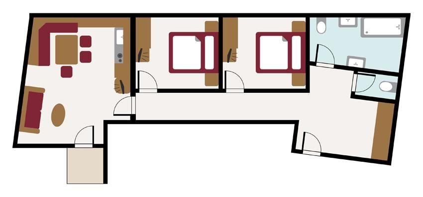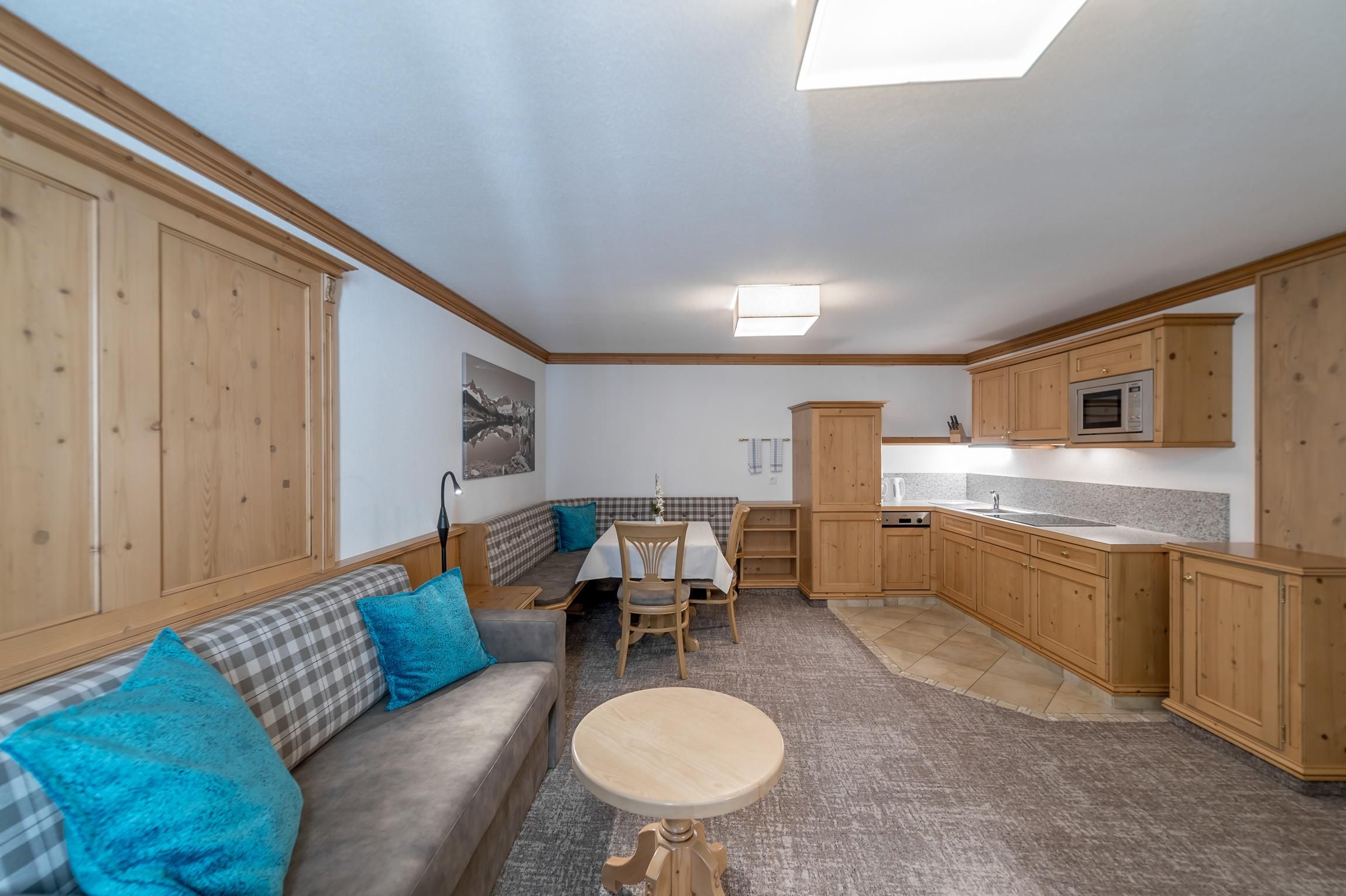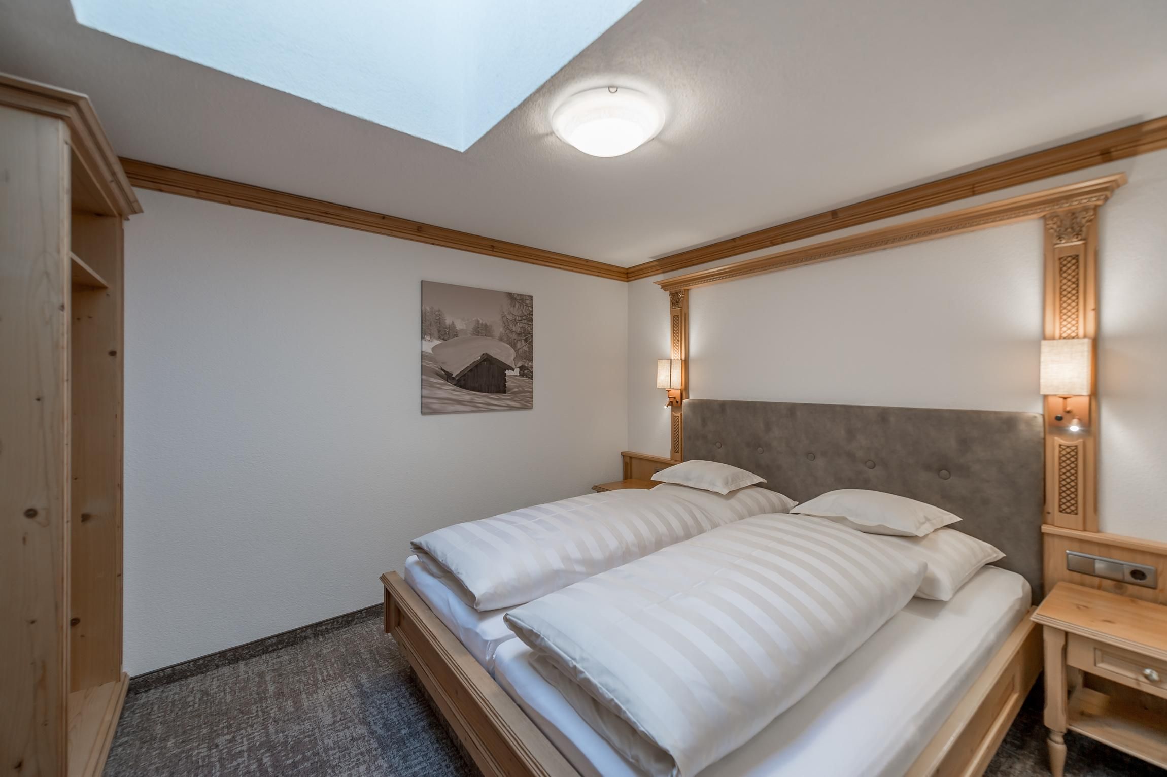 2 Schlafzimmer mit elektrischen Dachfenstern (nicht im Souterrain), 1 Wohnküche mit Balkon, Kachelofen, komplett eingerichtete Küche, Badezimmer mit Bad / Dusche, WC, Fön, Kabel-TV, Wireless Internet, Telefon, Safe.
