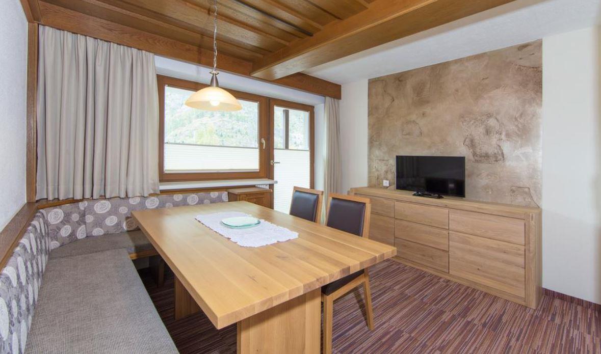 1 Wohnzimmer mit SAT-TV und Essbereich, sowie Balkon mit traumhafter Aussicht auf die Ötztaler Bergwelt