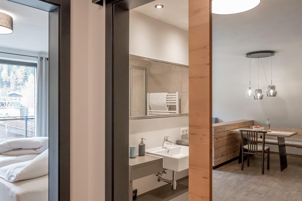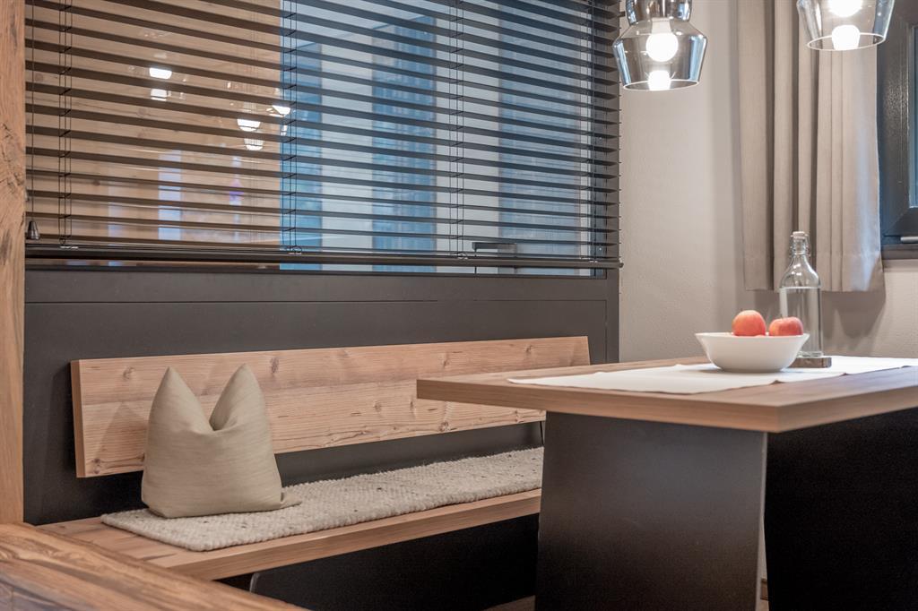 Moderne und hochwertige Designelemente, gemixt mit authentischem Tiroler Flair auf 40 m². Gemütliche Wohnküche mit Sitzecke, Esstisch, Geschirrspüler, Kühlschrank, Kaffeemaschine, Wasserkocher, Mikrowelle, 1 Doppelzimmer, Badezimmer mit Dusche, Föhn, Handtücher, Bademäntel, Schminkspiegel, separates WC, möblierte Sonnenterrasse.
