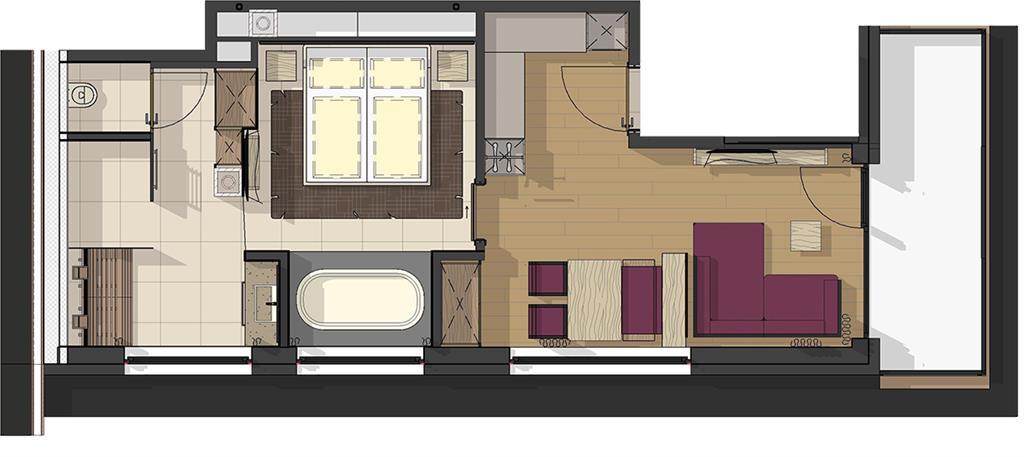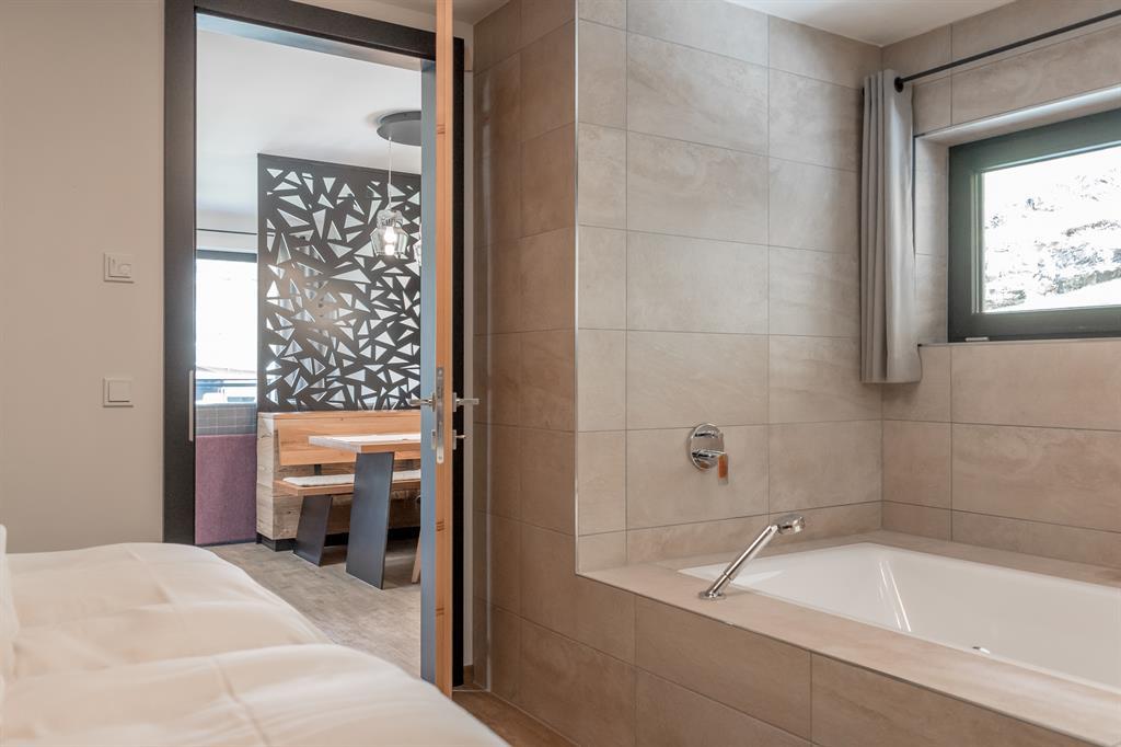 Den Gipfeln ein Stück näher - ihr eigener Privat-Spa, offener Badebereich, separates WC, Infrarotkabine sowie die Terrasse mit herrlichem Ausblick, machen ihren Urlaub zum einzigartigen Erlebnis. 1 Doppelzimmer, Wohnküche mit Sitzecke und Ausziehcouch, Geschirrspüler, Ceran-Kochfeld, Backrohr, Kühlschrank, Kaffeemaschine, Wasserkocher, Mikrowelle. Größe ca. 47 m².