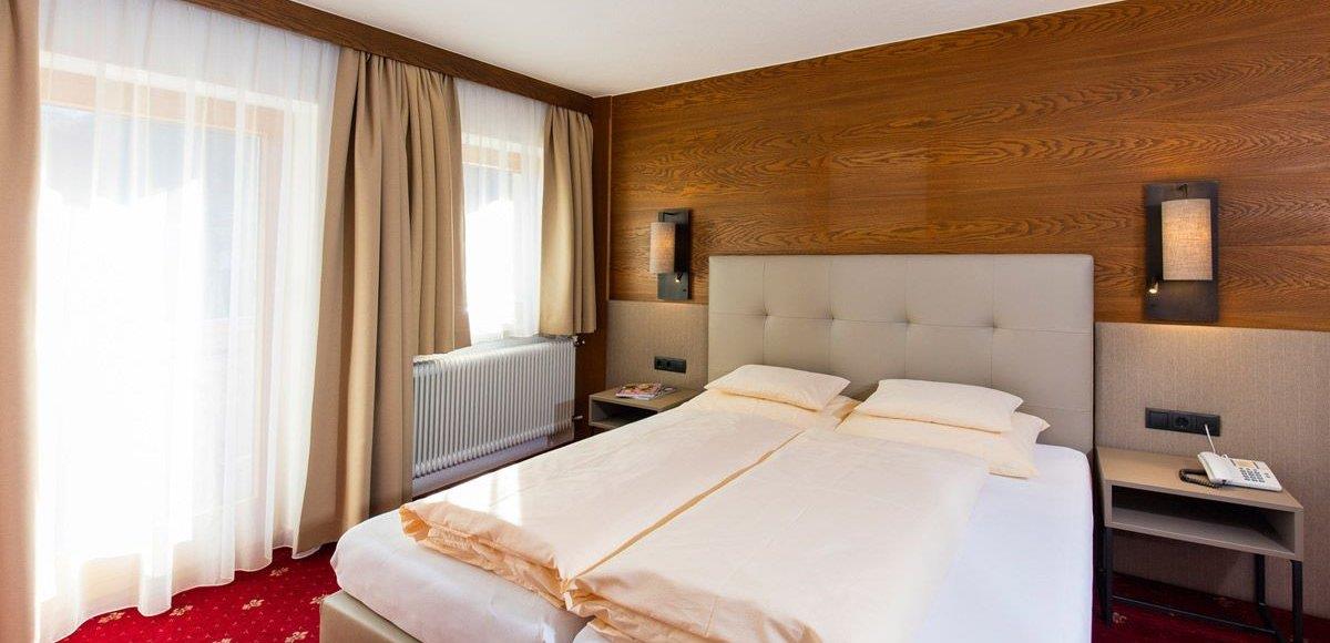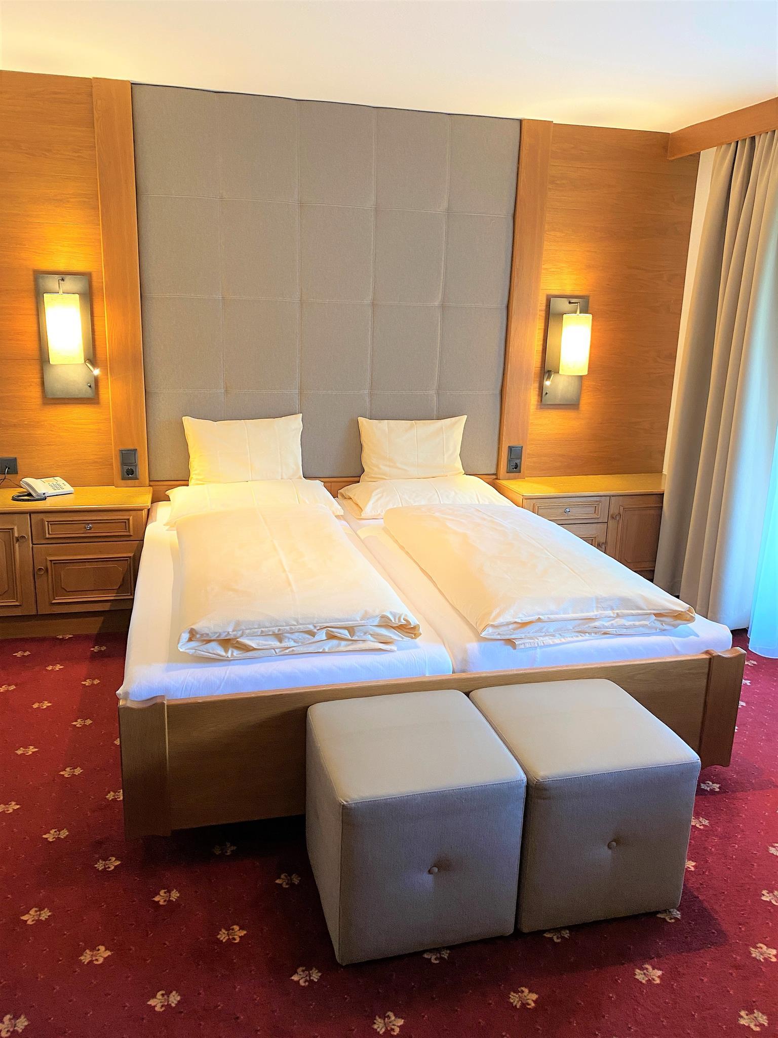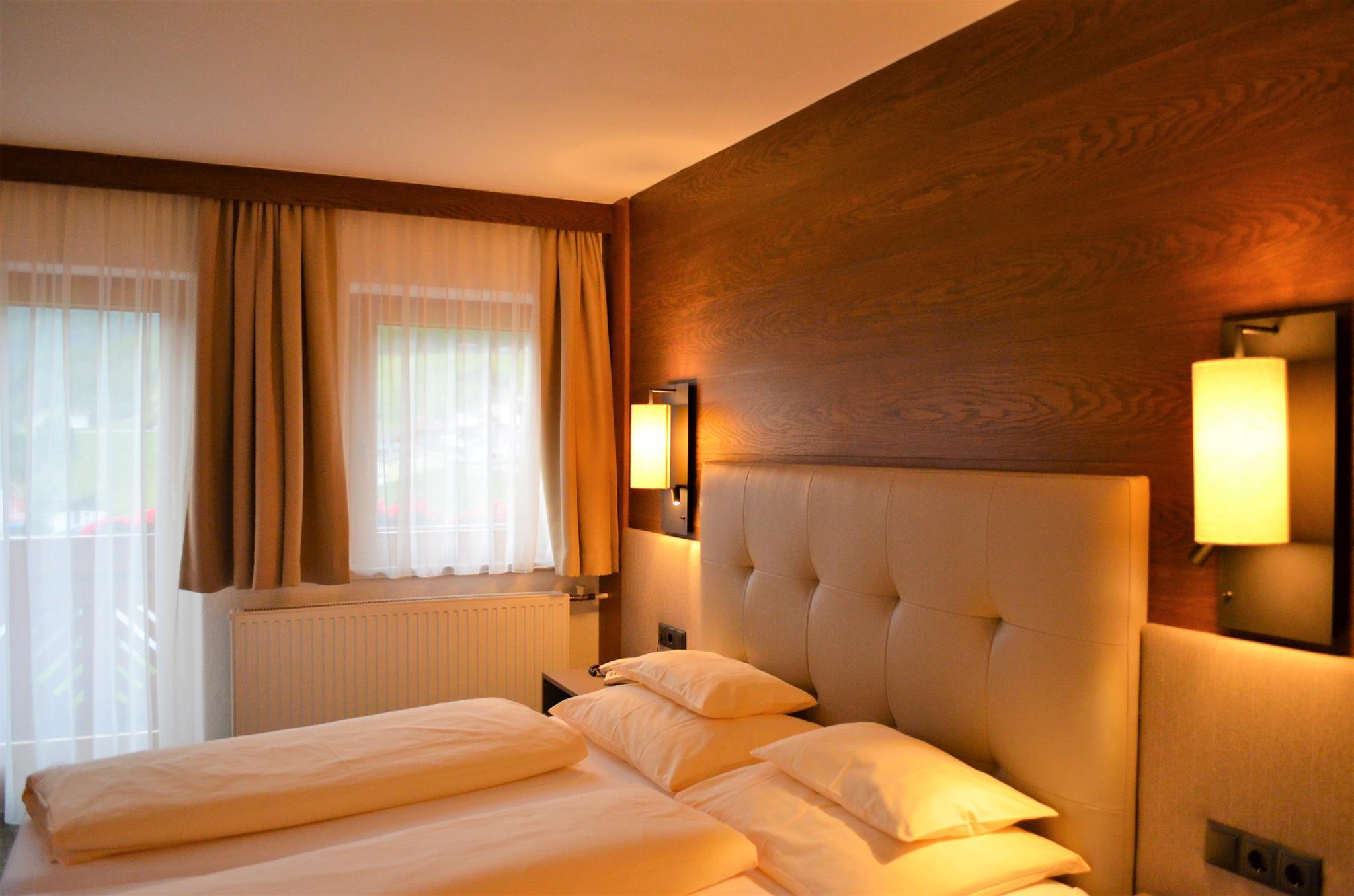 Doppelzimmer (ca. 20 m²) vorwiegend mit Blick auf die umliegende Bergwelt. Gemütlich eingerichtetes Zimmer mit Telefon und Kabel-TV, 1 Badezimmer mit bodengleicher Dusche/WC, Haarfön und größtenteils Balkon.