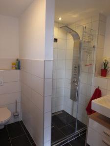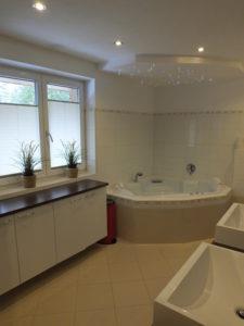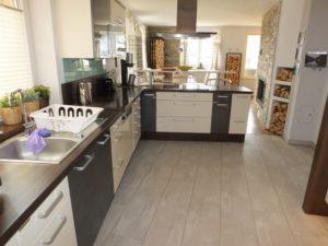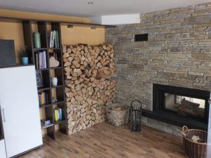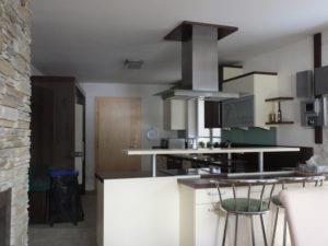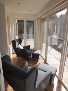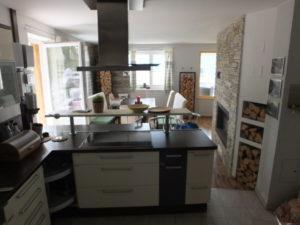 Im Erdgeschoss Badezimmer mit Dusche & WC, großzügige, moderne, offen gehaltene Küche mit Cerankochfeld, Backofen, Mikrowelle, Spülmaschine, Wasserkocher, Kühlschrank und Kaffeemaschine, Haushaltsraum mit Waschmaschine, Essbereich mit Kamin, ein Hochstuhl für Kleinkinder und Kinderstuhl für ältere Kinder sind vorhanden, weitläufiges Wohnzimmer mit Glaserker, Sofaecke, TV und Kamin.