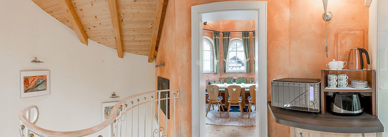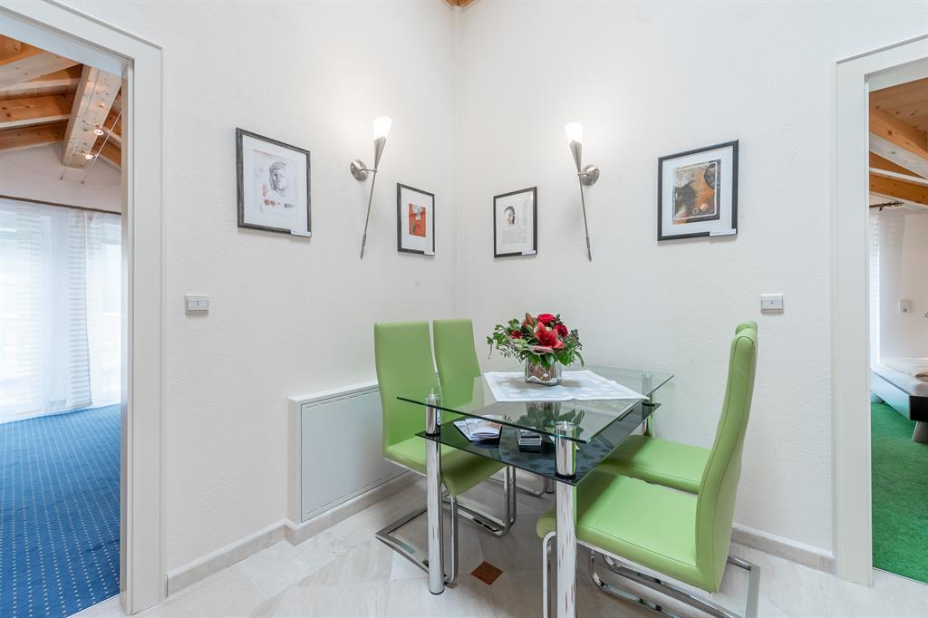 3 großzügige Doppelzimmer mit TV und jeweils einem Badezimmer (1x Badewanne/WC, 2x Dusche/WC) und Balkon. Zustellbett in den Zimmern möglich. Das Highlight des Appartements bildet die Essecke in unserem „Turm“ mit sehr kleiner Kochgelegenheit (4-Platten-Cerankochfeld, Kühlschrank, Geschirr, Kaffeemaschine uvm.) und ein zusätzlicher kleiner Wohn-Schlafraum mit einem Schlafsofa und TV. Gesamtgröße ca. 120 m².