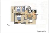 Appartement Top 1 im 1. Stock mit 2 getrennten Schlafzimmern (1x Doppelbett mit Zustellcouch, 1 x Doppelbett mit Enzelbett), 1 x Badezimmer mit Dusche/WC, 1 x Badezimmer mit Dusche - jeweils mit Haarföhn, 1 vollausgestattete Wohnküche mit Essbereich, Ceran-Kochfeld, Geschirrspüler, Kühlschrank, Mikrowelle uvm., Kabel-TV, Radio und Balkon. Größe: ca. 58 m².