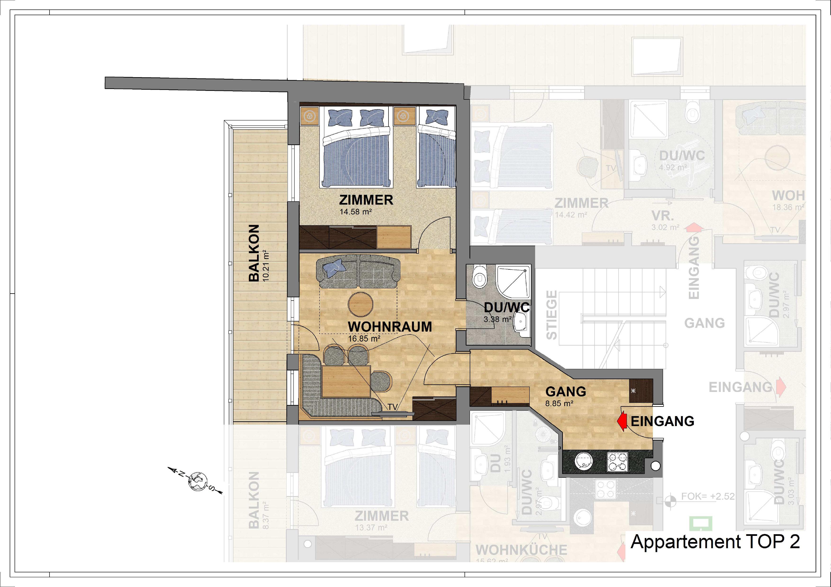 Appartement Top 2: 1 Badezimmer mit Dusche/WC und Haarföhn, 1 Schlafzimmer mit 3 Betten (Doppelbett und Einzelbett), 1 vollausgestattete Küche mit Ceran-Kochfeld, Geschirrspühler, Kühlschrank, Mikrowelle uvm., 1 Wohnzimmer mit Essbereich, Schlafsofa für 2 Personen, Kabel-TV, Radio und Balkon. Größe ca. 42 m².
