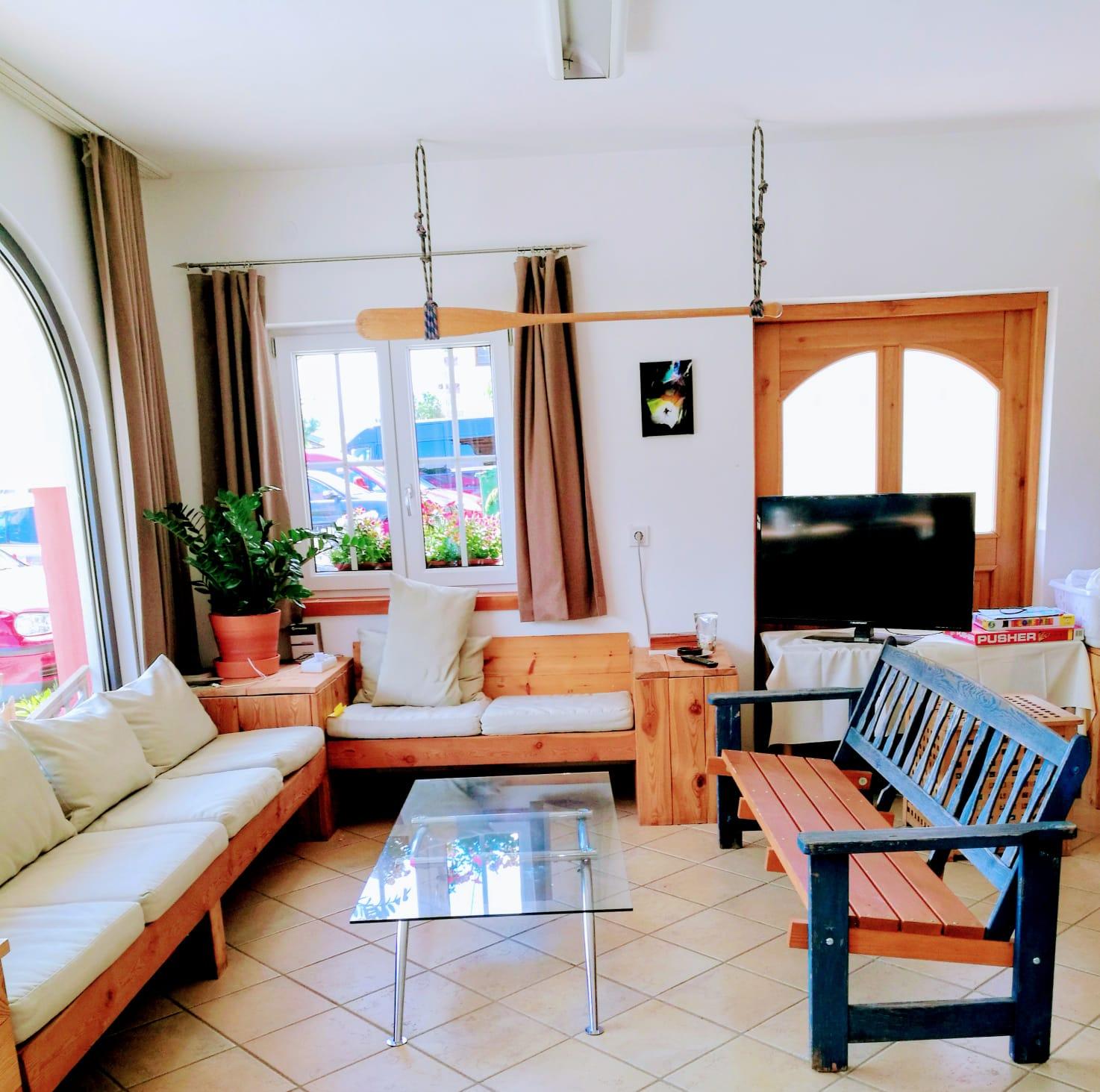 Das Zimmer ist ausgestattet mit: 2 x Stockbetten, Balkon, 1 x Badezimmer mit Dusche, separates WC. Die Gemeinschaftsküche ist bestens ausgestattet mit Kaffeemaschine, Backofen, Kühlschrank, kleine Annehmlichkeiten wie Öl, Salz und Pfeffer sind vorhanden. Der Gemeinschaftsraum und die Grillecke stehen allen unseren Hausgästen zur Verfügung. Nach der Benützung ist die Küche bzw. Grillplatz aufgeräumt und sauber zu hinterlassen.