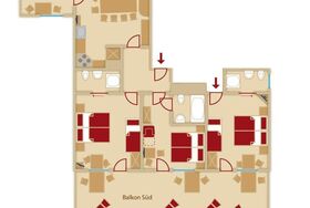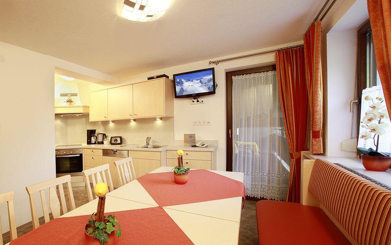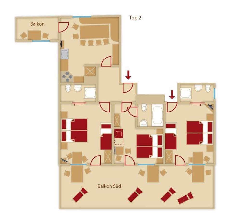 Top 2 (ca. 70 m²) für 6-9 Personen: 3 Doppelzimmer (auch als Dreibettzimmer möglich) mit Südbalkon, Telefon, Radio, Safe, Kabel-TV, Dusche oder Badewanne / WC, Haartrockner. Sehr geräumige Wohnküche, komplett ausgestattet mit großer Sitzecke, Herd mit Backrohr, Kaffeemaschine, Wasserkocher, Kühlschrank, Mikrowelle, Mixer, Eierkocher, Geschirrspüler und Balkon. Abgeschlossenes Appartement plus 1 Dreibettzimmer außerhalb der Wohnung direkt nebenan.