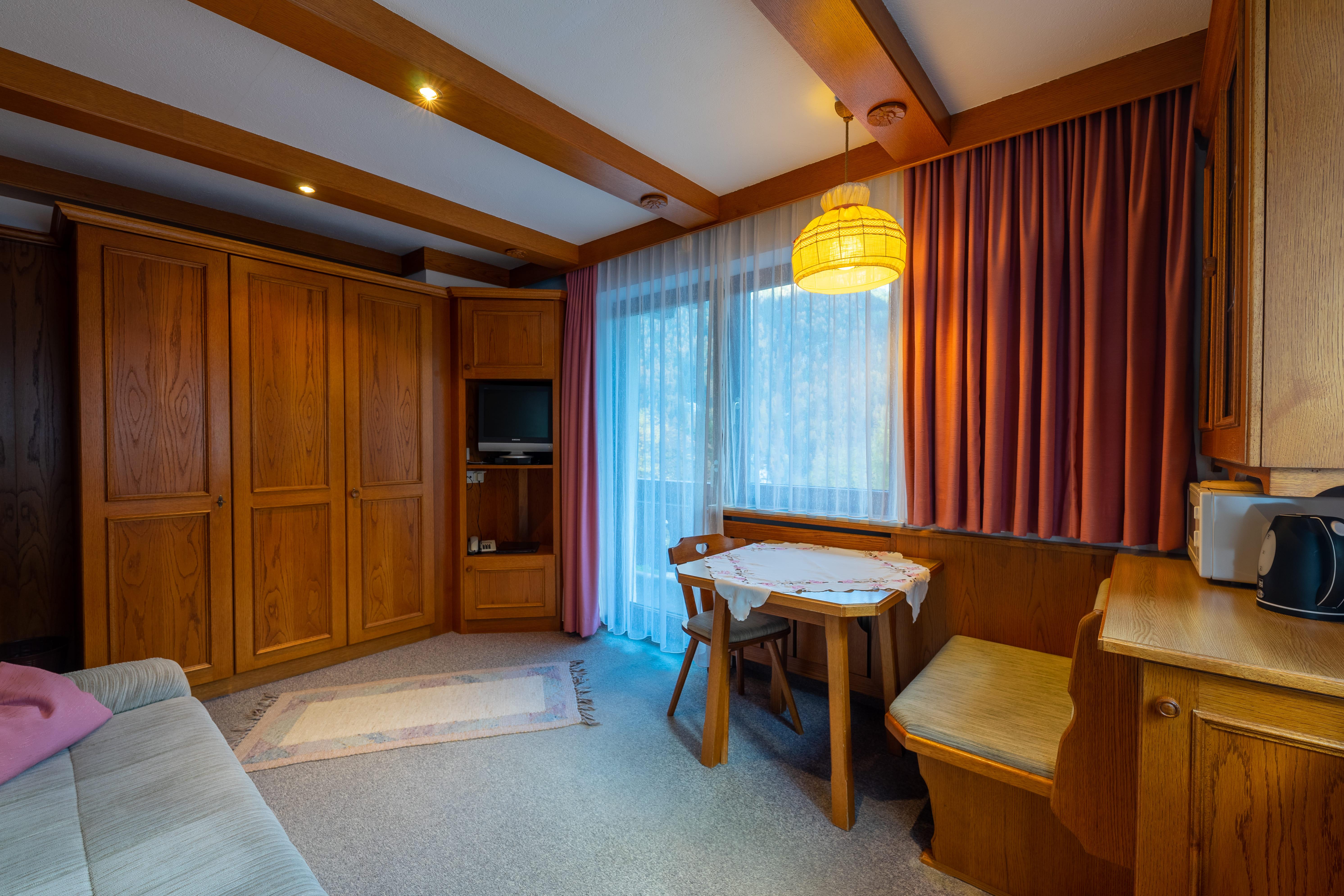 Gemütliches Appartement mit 1 Wohnschlafzimmer mit Doppelschrankbett und Couch, inkl. Eßecke, Flat-TV, Telefon, Bad, WC, Haarfön, Kleinküche (Geschirrspüler, Mikrowelle), Vorraum, Garderobe und Südbalkon. Größe: ca. 32 m².