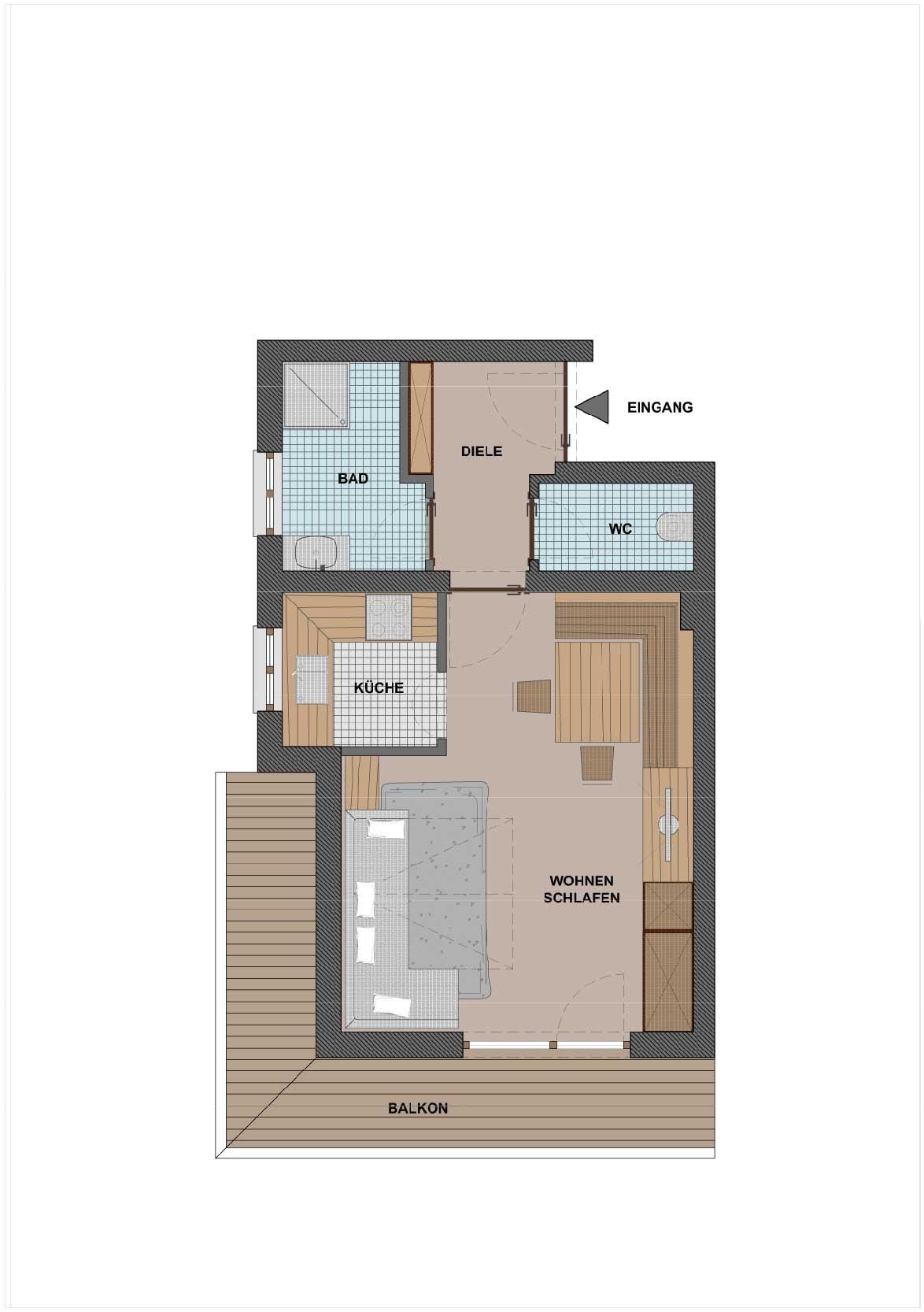 Vorraum mit Garderobe, ein Wohnschlafraum mit Doppelcouch (zwei Schlafmöglichkeiten), Dusche, separate Toilette, kleine Küche m. Essecke.