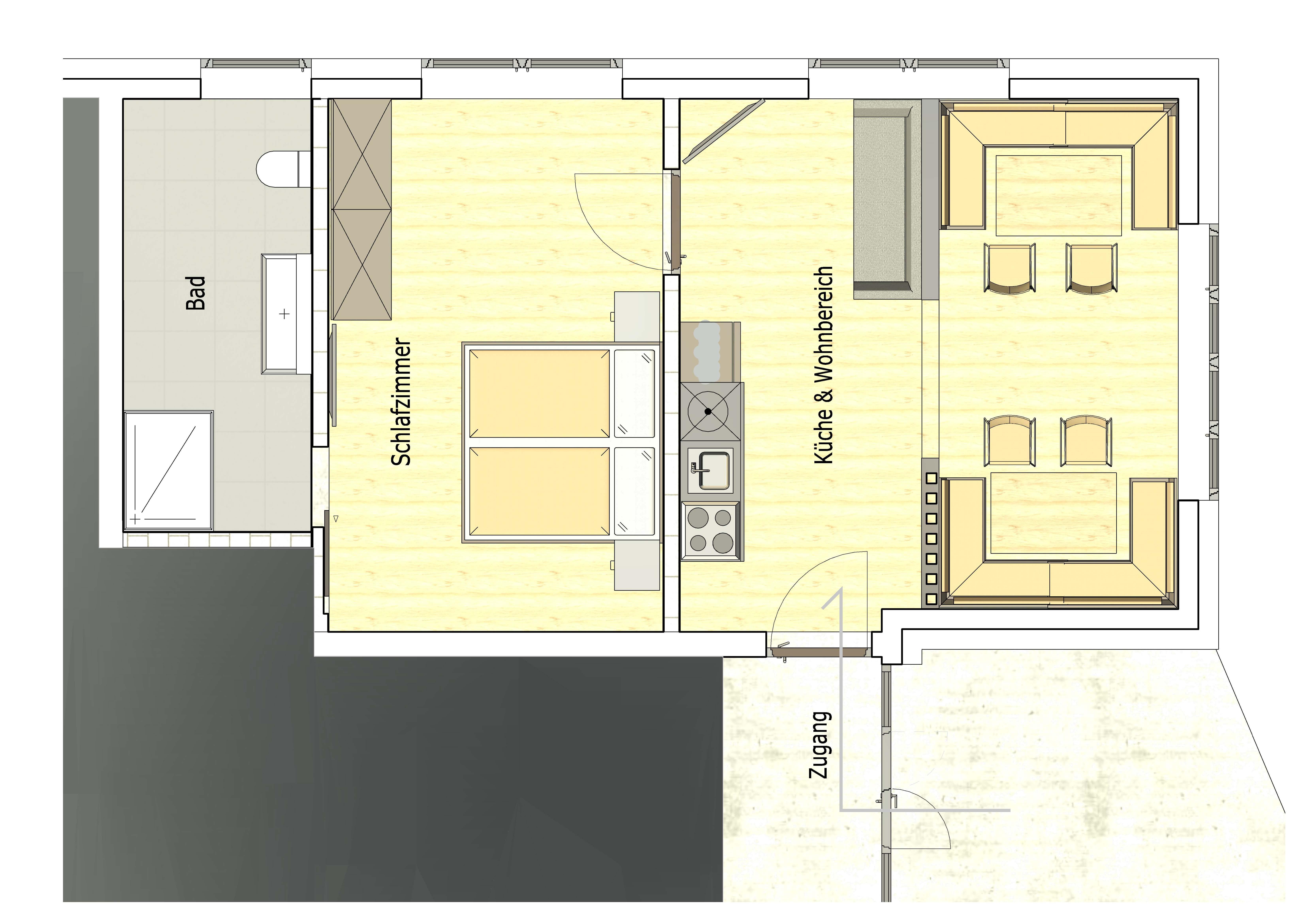 DasAppartement (ca. 50 m²) verfügt über 1 Zirbenholz-Doppelzimmer mit Flat-TV und einem Badezimmer mit Dusche/WC. Zudem bietet es einegroßzügige, voll ausgestattete Wohnküche (Cerankochfeld, Backrohr, Mikrowelle,Kühlschrank/Gefrierfach, Spülmaschine, Kaffeemaschine, Toaster, uvm.) mit einerDoppelausziehcouch (Schlafmöglichkeit für die 3. und 4. Person). Genießen Siedas einzigartige Bergpanorama im möblierten Gemeinschaftsgarten.
