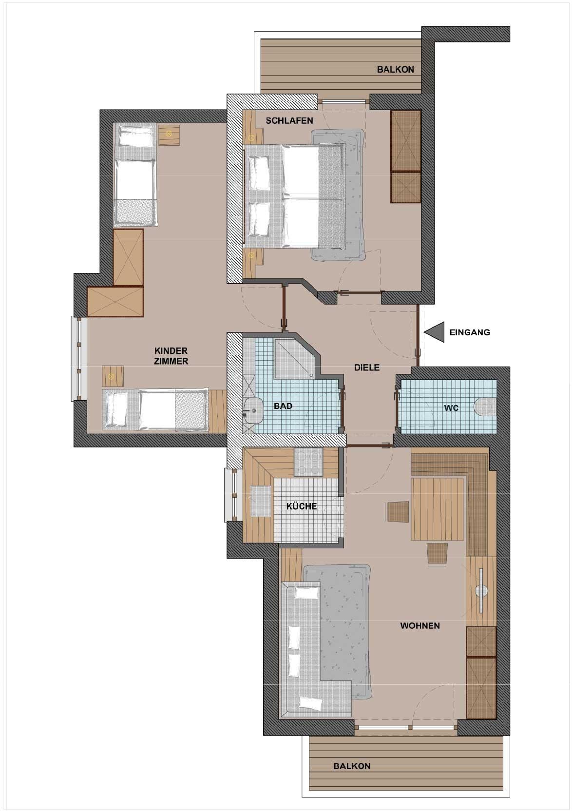 Vorraum mit Garderobe, zwei Schlafzimmer, ein Wohnschlafraum mit zwei Schlafmöglichkeiten, Badezimmer mit Dusche, seperate Toilette, kleine Küche, Essecke, zwei abgetrennte Balkone mit Lage nach Süd-West, Brötchenservice, W-Lan