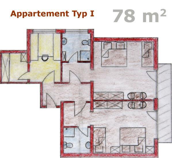 Appartement für 2-6 Personen mit 2 Schlafzimmern (Doppelzimmer oder Dreibettzimmern) jeweils Dusche/WC, großer eigener Balkon, eine vollausgestattete Küche mit Esszimmer und Flat-TV, W-Lan, Kühlschrank, Herd mit 4 Kochplatten, Backrohr, Mikrowelle, Spülmaschine, Kaffeemaschine, sämtl.Geschirr. (Größe: ca. 78 m²)
