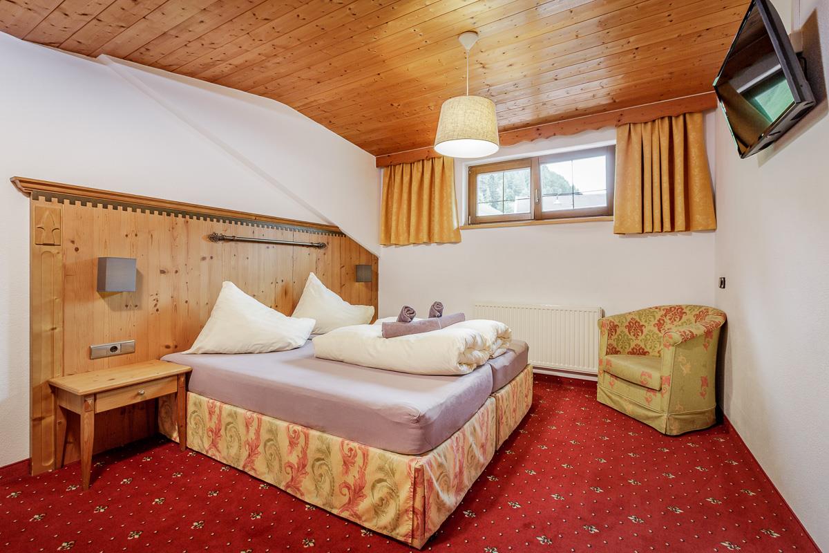 Gemütliche, im Tiroler Landhausstil eingerichtete Doppelzimmer mit Flat-TV, Zimmersafe und Dusche/WC/Haarföhn. Auf Anfrage getrennte Betten möglich!