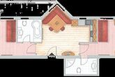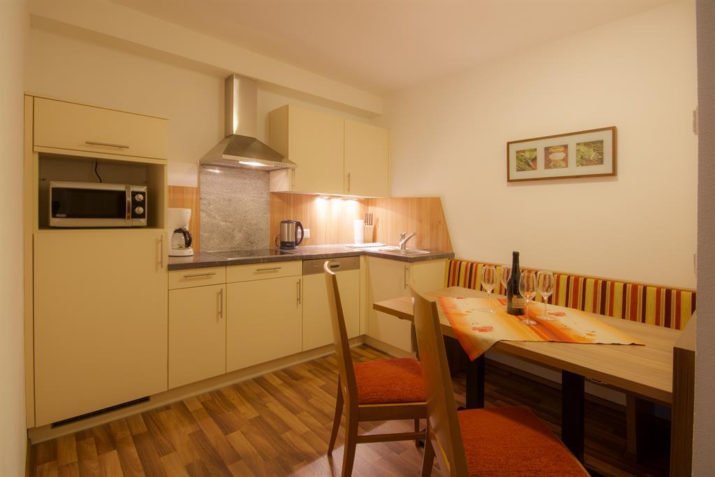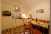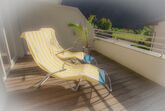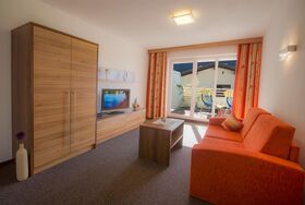 Zwei getrennte Schlafzimmer mit Doppelbett und Querschläfersofa, Kleiderschrank, Schreibtisch, Sat TV, Garderobe mit Spiegel, Wohnraum mit Fernseh-schrank, Ausziehsofa mit Couch-tisch, Einbauküche mit Sitzecke. Küchenausstattung: Backrohr, Cerankochfeld, Geschirrspüler, Mikrowelle, Kühlschrank, 1 Dusche/WC, 1 Dusche/WC, Terrasse und Balkon