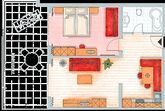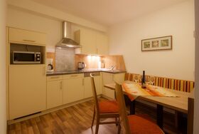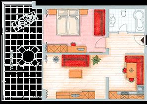 Schlafzimmer mit Doppelbett und Querschläfersofa, Kleiderschrank, Schreibtisch, Sat TV, Wohnraum mit Fernseh-schrank, Ausziehsofa mit Couch-tisch, Einbauküche mit Sitzecke. Küchenausstattung: Cerankochfeld, Geschirrspüler, Mikrowelle, Kühlschrank Dusche/WC, Grosse Terrasse.