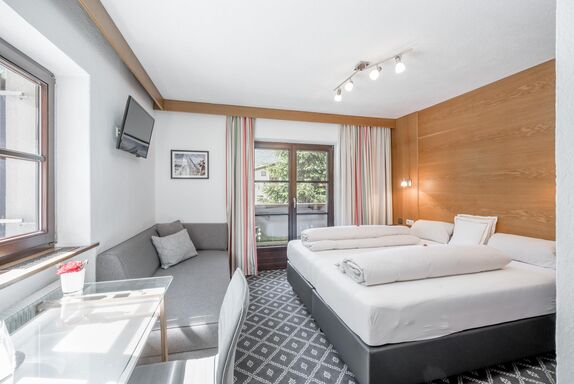 Genießen Sie unser liebevoll gestaltetes Zimmer aus Holz für bis zu 3 Personen. Ausgestattet mit Dusche/WC, Föhn, Radio, Telefon, Flachbildfernseher, Zimmersafe, Schlafcouch für eine weitere Person und Balkon. Größe ca. 20 m²