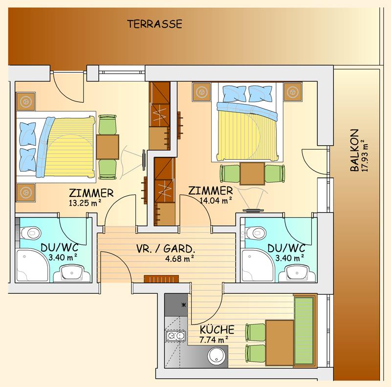 Gemütliches Appartement im 2.Stock mit Vorraum, Wohnküche 2 Doppelzimmer, Dusche/WC, Fön, Kabel-TV, Radio,Telefon, Safe. Größe ca. 48 m²