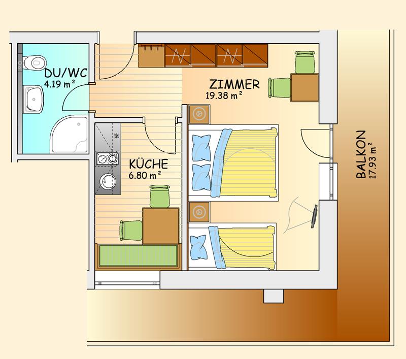 Modern ausgestattetes Studio im 2. Stock mit Wohnküche, 1 Schlafzimmer mit Schlafcouch, Badezimmer mit Dusche/WC und Fön, Radio, Kabel-TV, Telefon und Safe.