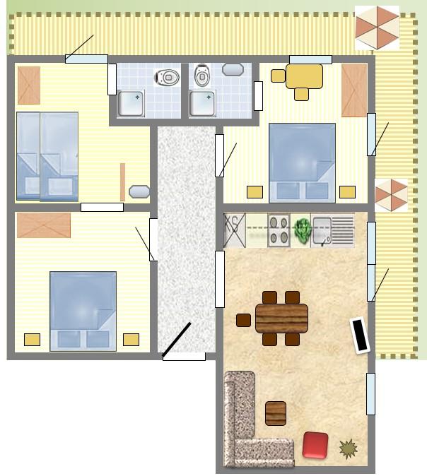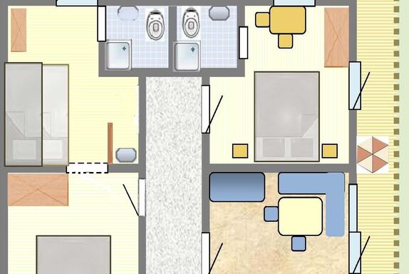 Die Ferienwohnungen sind für 2 bis 5 Personen geeignet, wobei die Wohnungen getrennte Schafzimmer aufweisen.