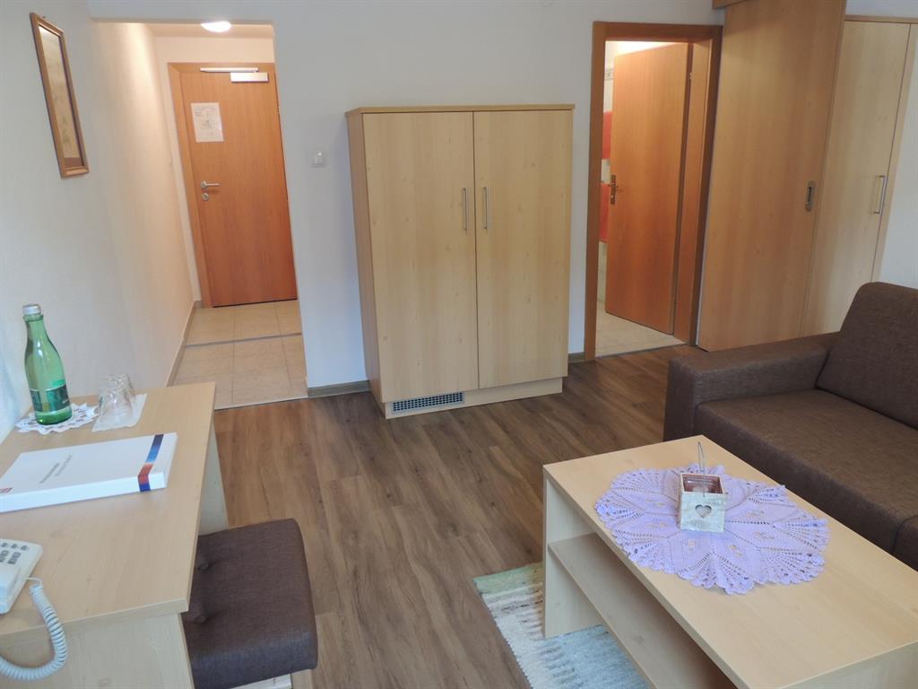 Unsere neue Suite wird Sie Begeistern! Auf ca. 50 m² finden Sie einen getrennten Schlaf- und Wohnbereich mit einem Doppelbett (180 x 200 cm), einem zusätzlichen Schlafsofa, eine Kommode, einen großen LCD-Flachbildfernseher, Telefon und Südbalkon. Zusätzlich ein Badezimmer mit Dusche, Waschtisch und Haarföhn und ein separates WC.