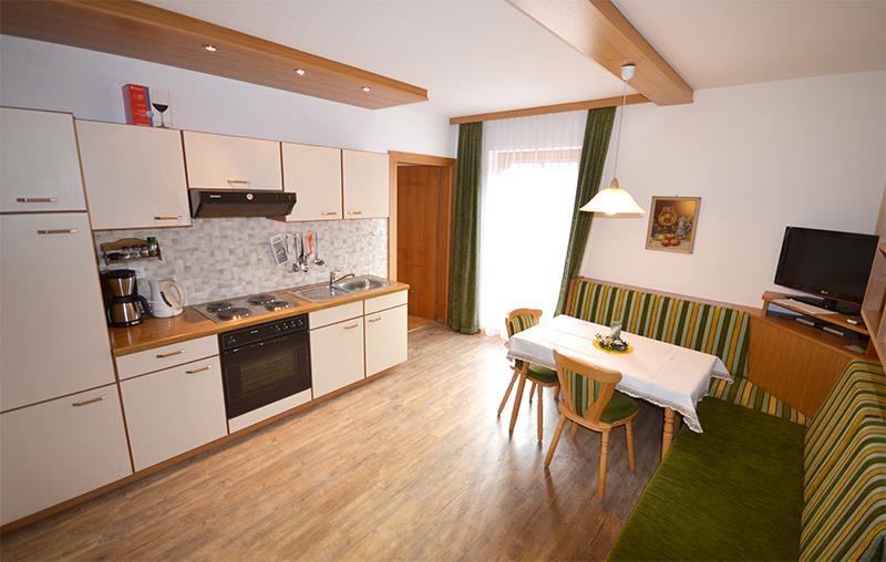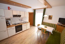 40m² Appartement im 1.Obergeschoss:1 Schlafzimmer (1,80x2m Bett) und Extrabett, kleines Badezimmer mit Dusche/WC, gut ausgestattete Wohnküche mit Sofa und gemütlicher Eckbank mit Esstisch. Flat-Screen, sonniger Südbalkon mit Bergpanorama