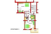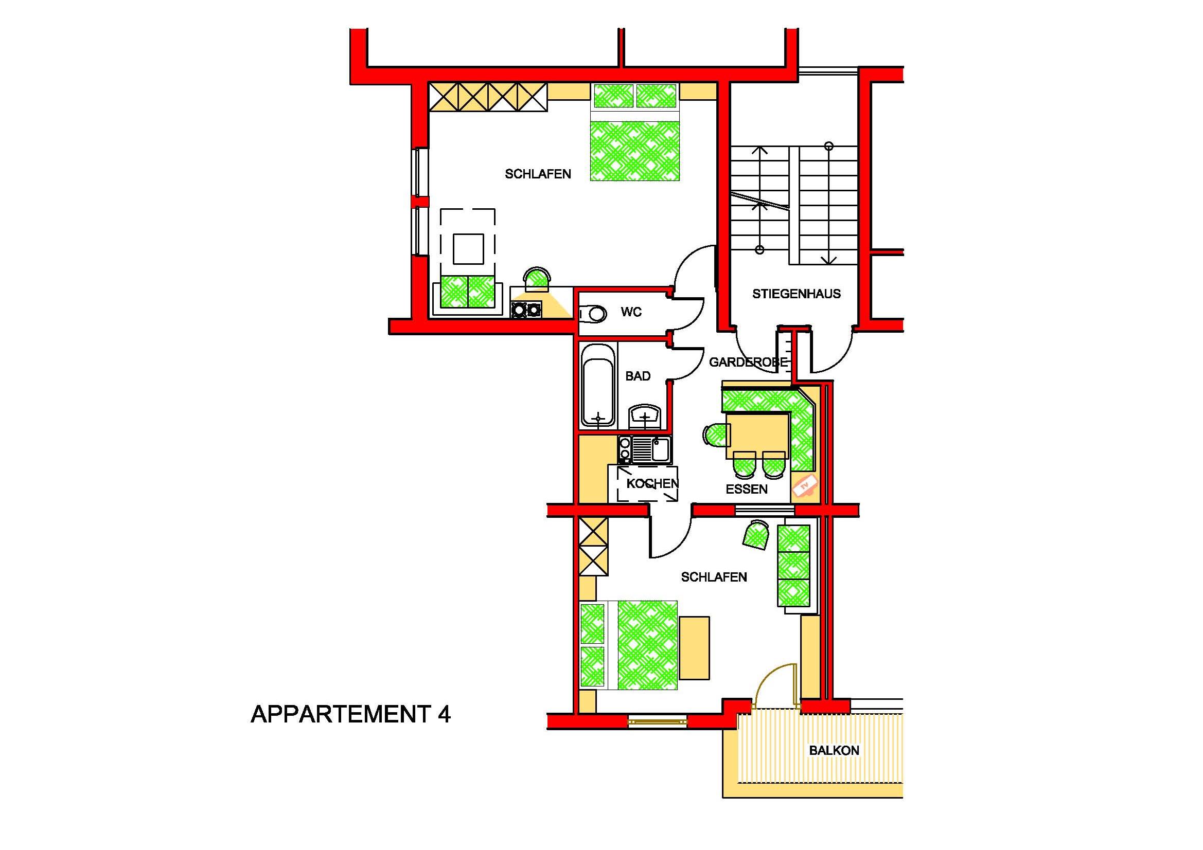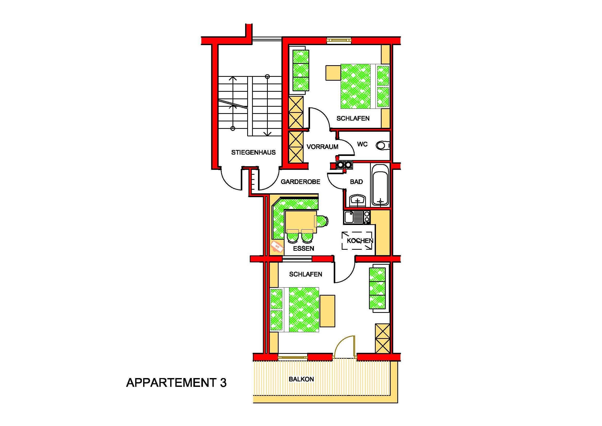 Appartement mit 2 Doppelzimmer, Wohnbereich mit Essecke und Kochnische mit 2-Platten-Herd, Kaffeemaschine, Mikrowelle uvm. , 1 Badezimmer mit Badewanne, separates WC, Safe, TV mit Infokanal und Panoramakanal. Südbalkon. Grösse ca. 65 m²