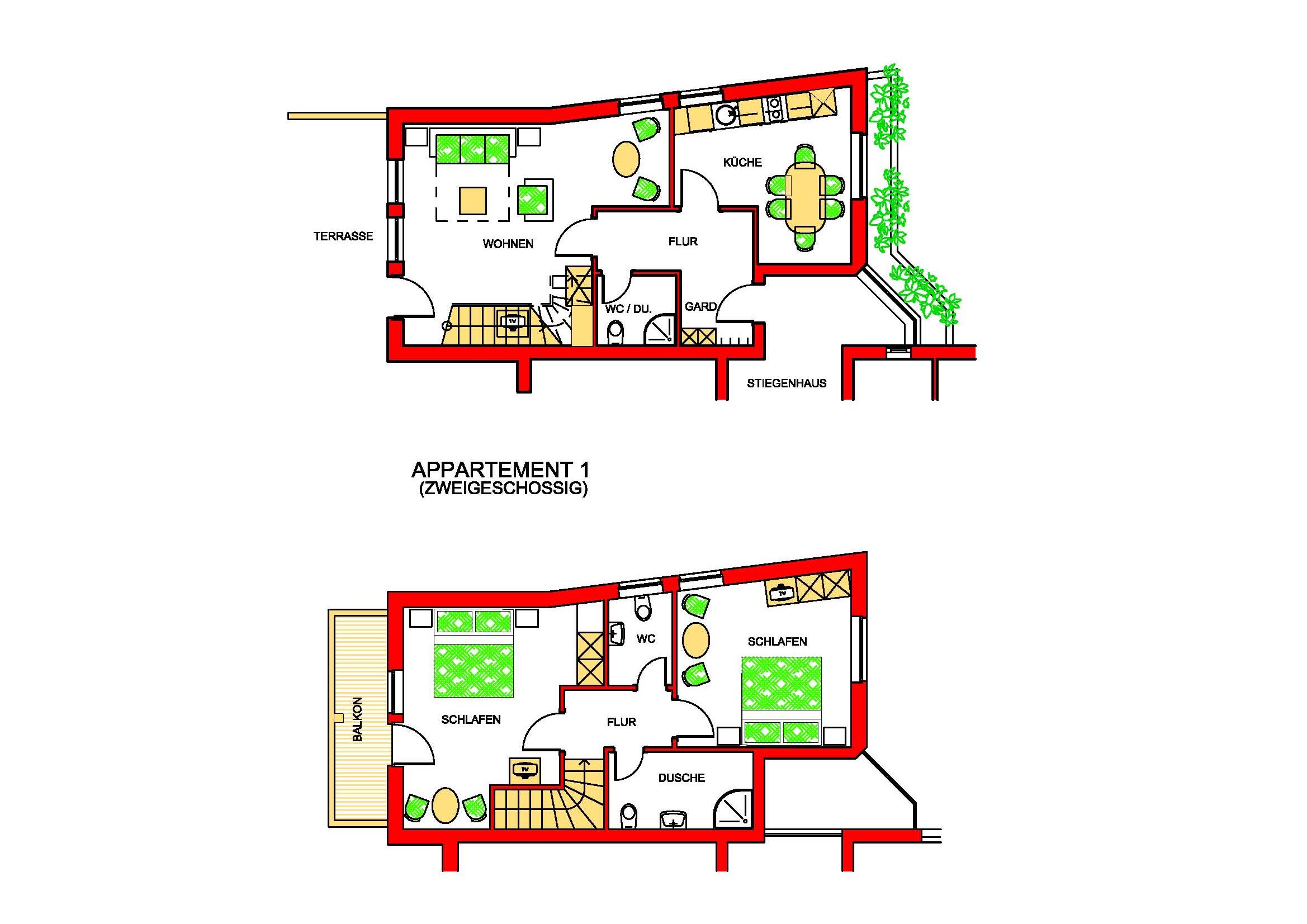 Appartement über 2 Etagen: 2 Doppelzimmer; 1 Wohn-Schlafzimmer mit Schlafsofa für 2 Personen; große, vollausgestattete Küche (Kaffeemaschine, Mikrowelle, 4-Platten-Herd, Geschirrspüler, Grilltoaster, usw.); 2 Badezimmer mit Duschen/WC und Haarfön; 1 WC separat; Safe, TV mit Panoramakanal und Infokanal. Balkon. Grösse ca. 80 m²