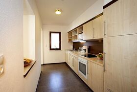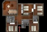 6 Zimmer-Wohnung, 2. Etage, ca. 117 m². 3 Dreibettzimmer, 1 Doppelzimmer, 3 Duschen/WC, Küche mit 4 Ceranfelder, Mikrowelle, Geschirrspüler, Backofen, Toaster, Heisswasserkocher, Kühlschrank. Alle Badezimmer mit Föhn und beheizten Handtuchhalter. 1 WC separat. Südbalkon. Jedes Schlafzimmer mit TV. Safe im Wohnraum.