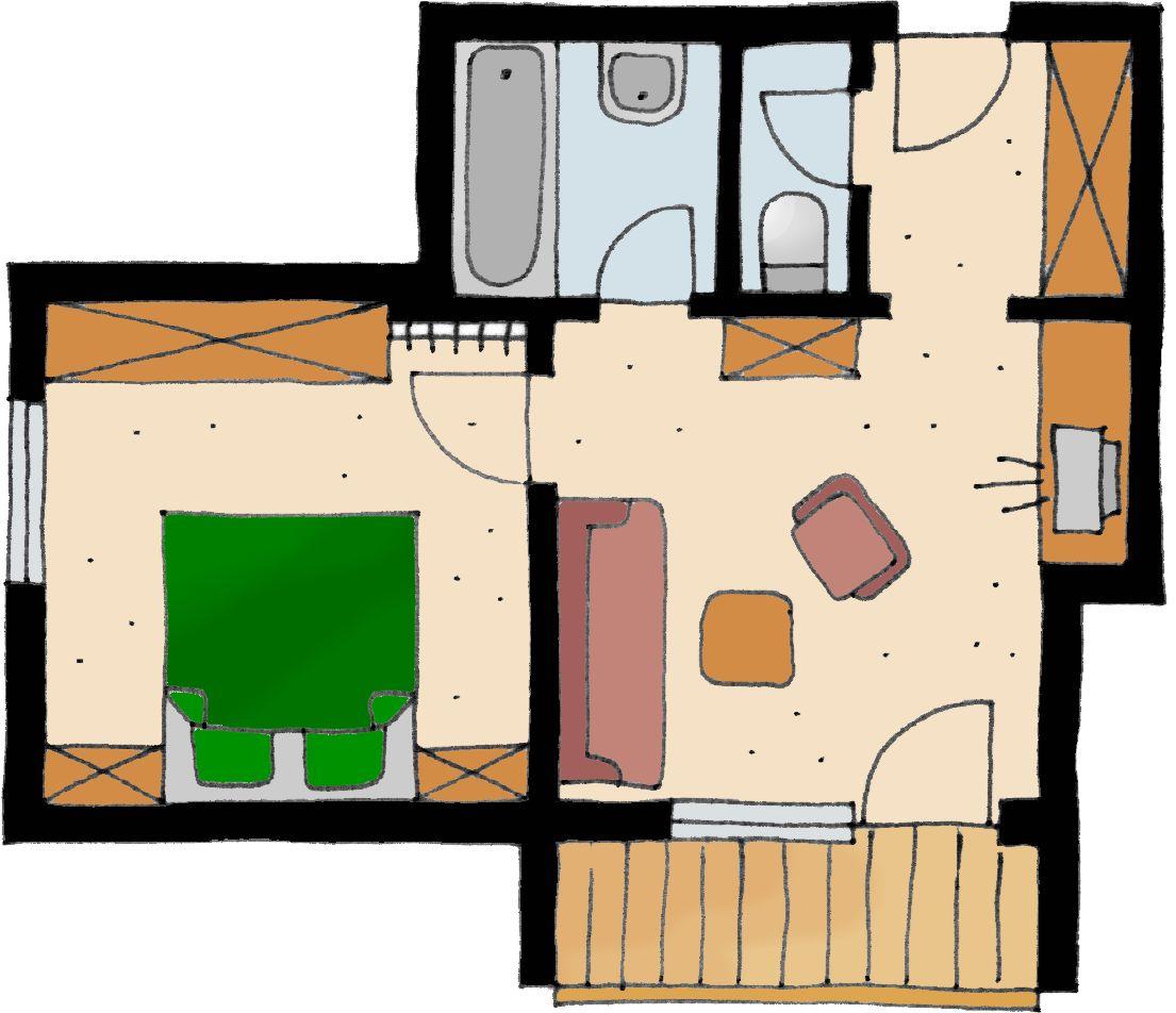 Landhausappartement mit ca. 38 m², Wohnschlafzimmer mit Sofa und Kachelofen, getrenntes Schlafzimmer, teils Balkon, Badezimmer mit Badewanne, WC separat, Fön, Bademäntel, Radio, Telefon, Kabel-TV, Safe.