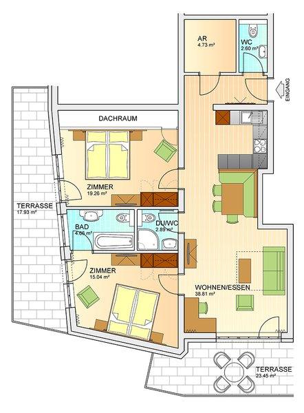 Rooftop Apart I mit ca. 90 m²: Tradition und Moderne vereint. 2 Schlafzimmer mit Doppelbett, großem Kleiderschrank und Flachbild Kabel-TV; 2 Badezimmer mit Dusche oder Badewanne und WC; großzügiger Wohnküche mit gemütlichem Esstisch, ausziehbarer Sofalandschaft, Flachbild Kabel-TV, voll ausgestatteten Küchenblock mit Backrohr, Mikrowelle, Geschirrspül- und Kaffeemaschine, Eierkocher, Toaster, komplette Geschirr- und Kochausstattung; großer, möblierter Balkon (Panoramablick auf Sölden).