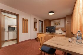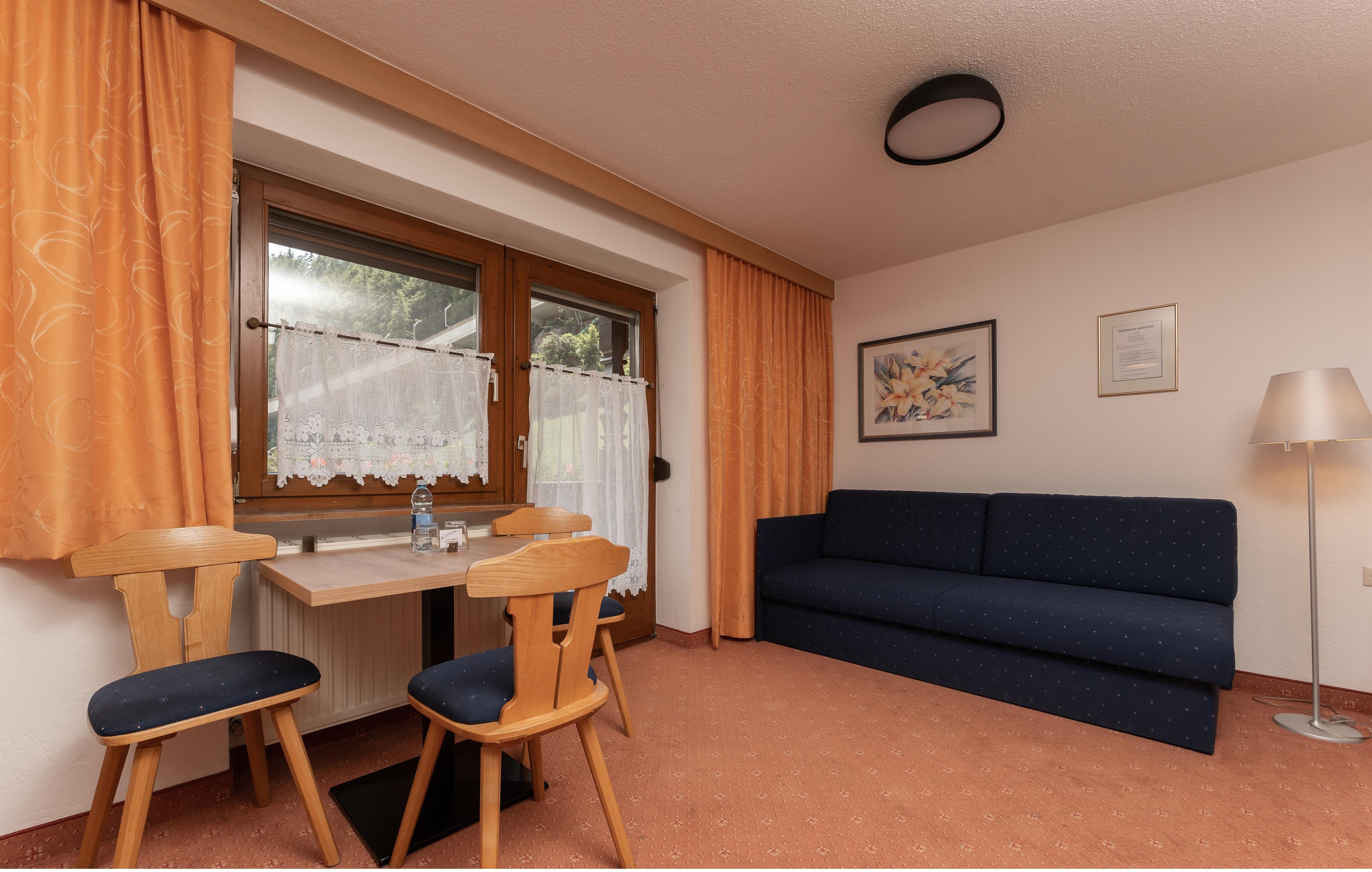 Gemütlich eingerichtetes Appartement mit einem Doppelzimmer mit integriertem Wohnbereich, Schlafsofa für die 3. Person, Kabel-Flat-TV, Safe, W-Lan und Balkon sowie ein Badezimmer mit Dusche/WC. Kleine Küche mit Kombi-Mikrowelle, 2-Herdplatten und Kühlschrank. Größe ca. 40 m².