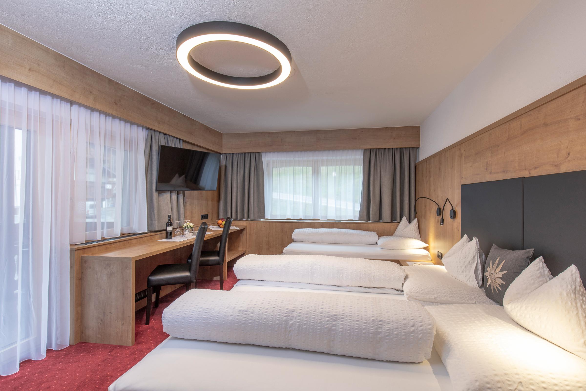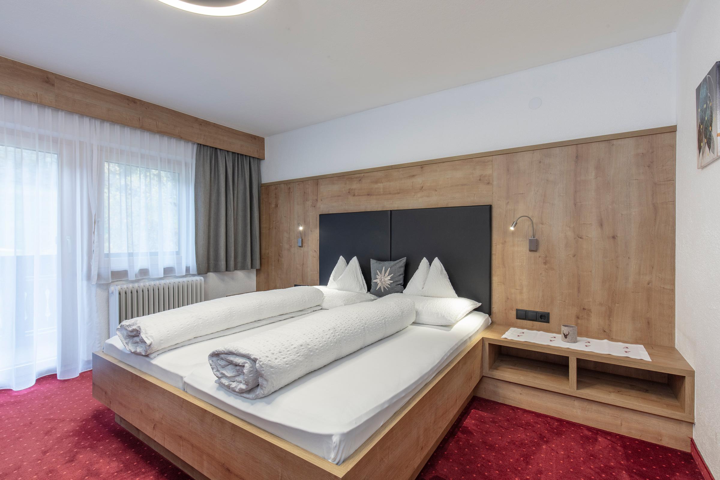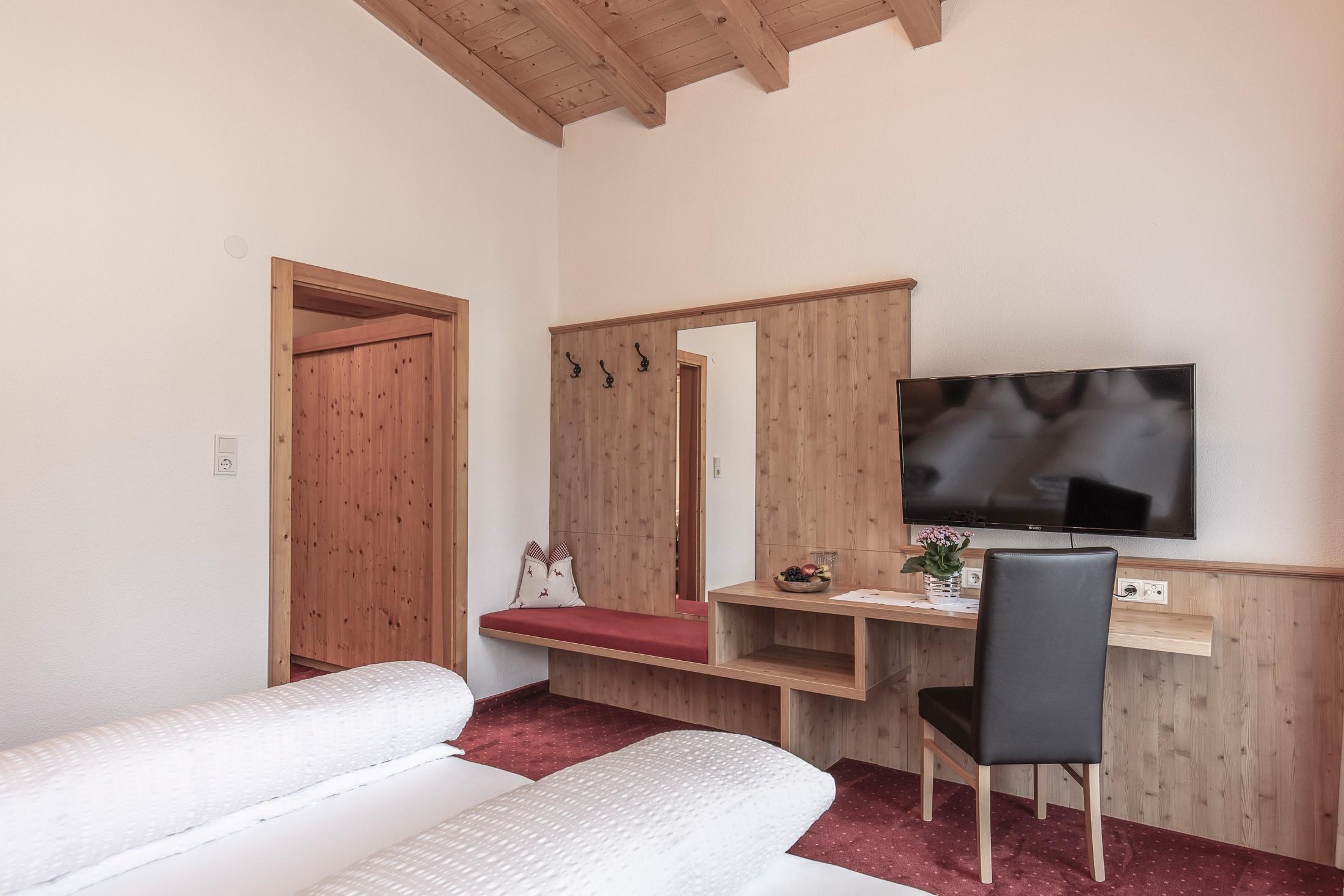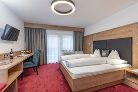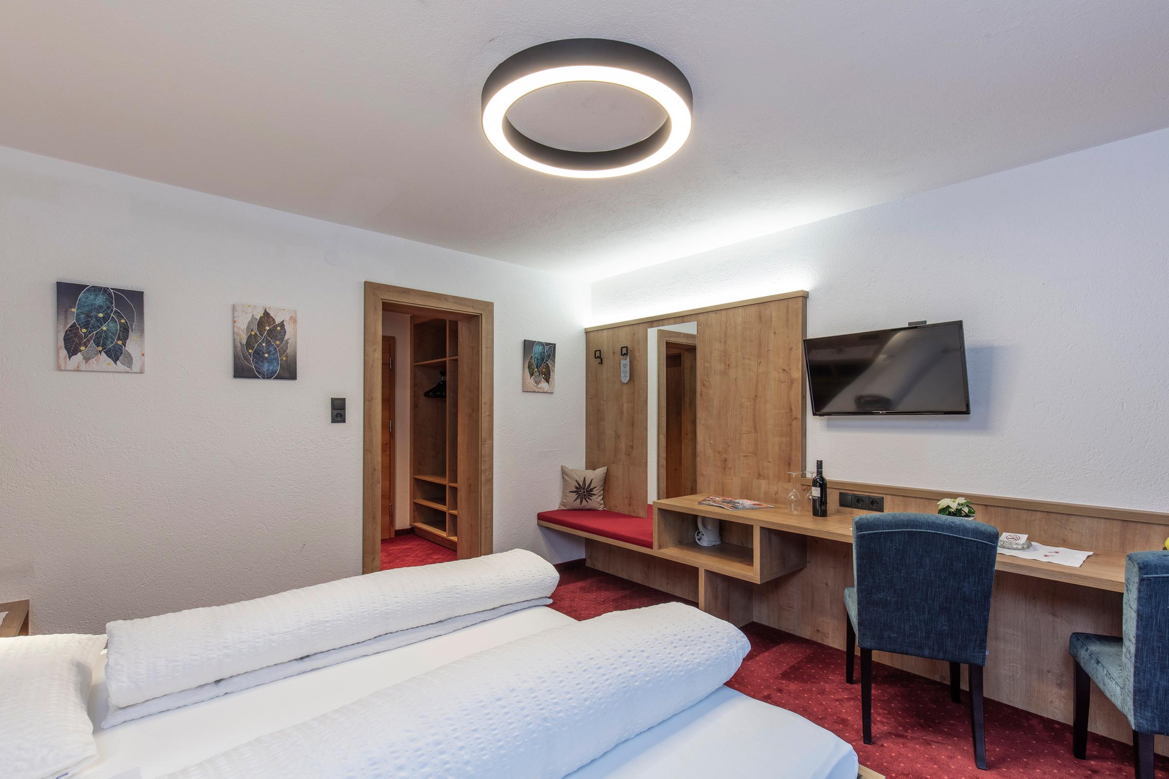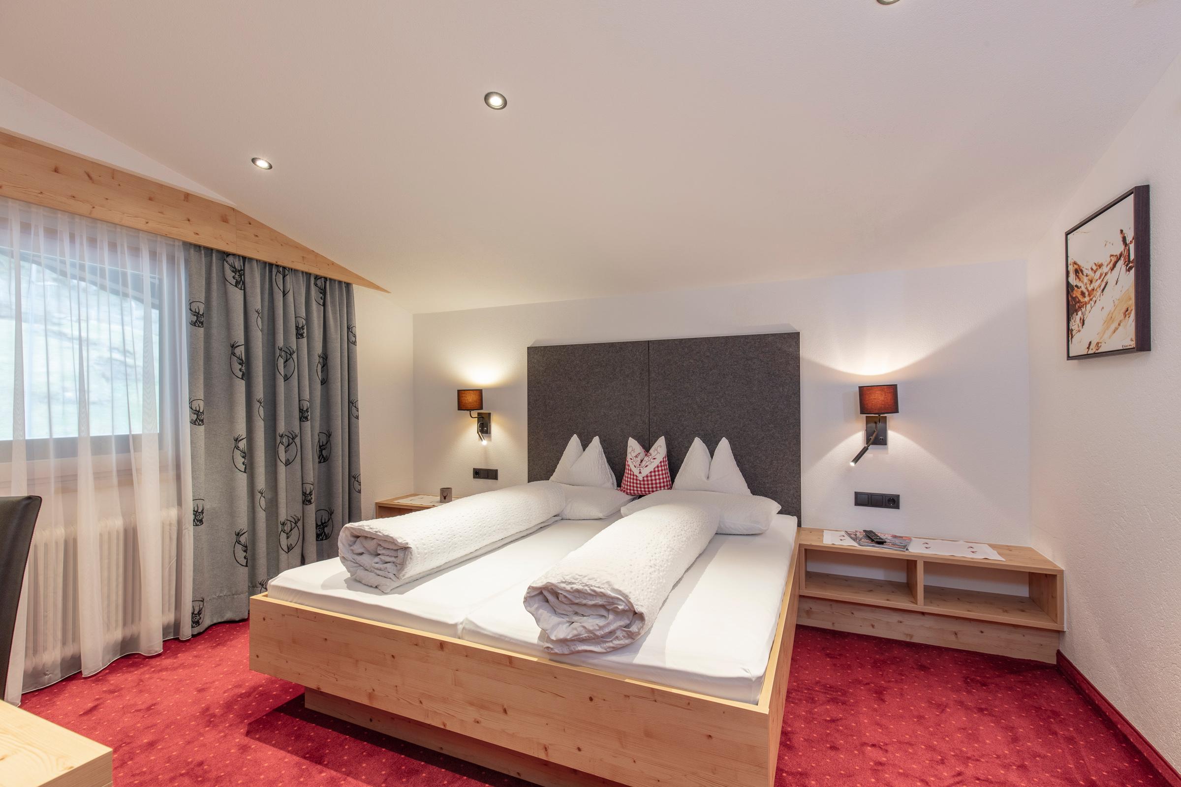 Unsere liebevoll eingerichteten Doppelzimmer mit Dusche/WC, Telefon, Flat-TV, Tresor, Schreibtisch, W-LAN sowie einem Balkon, von dem aus Sie einen eindrucksvollen Blick auf die Ötztaler Alpen haben. Ebenfalls inkludiert ist ein reichhaltiges Frühstücksbuffet mit unseren hofeigenen Produkten. Größe ca. 20 m².