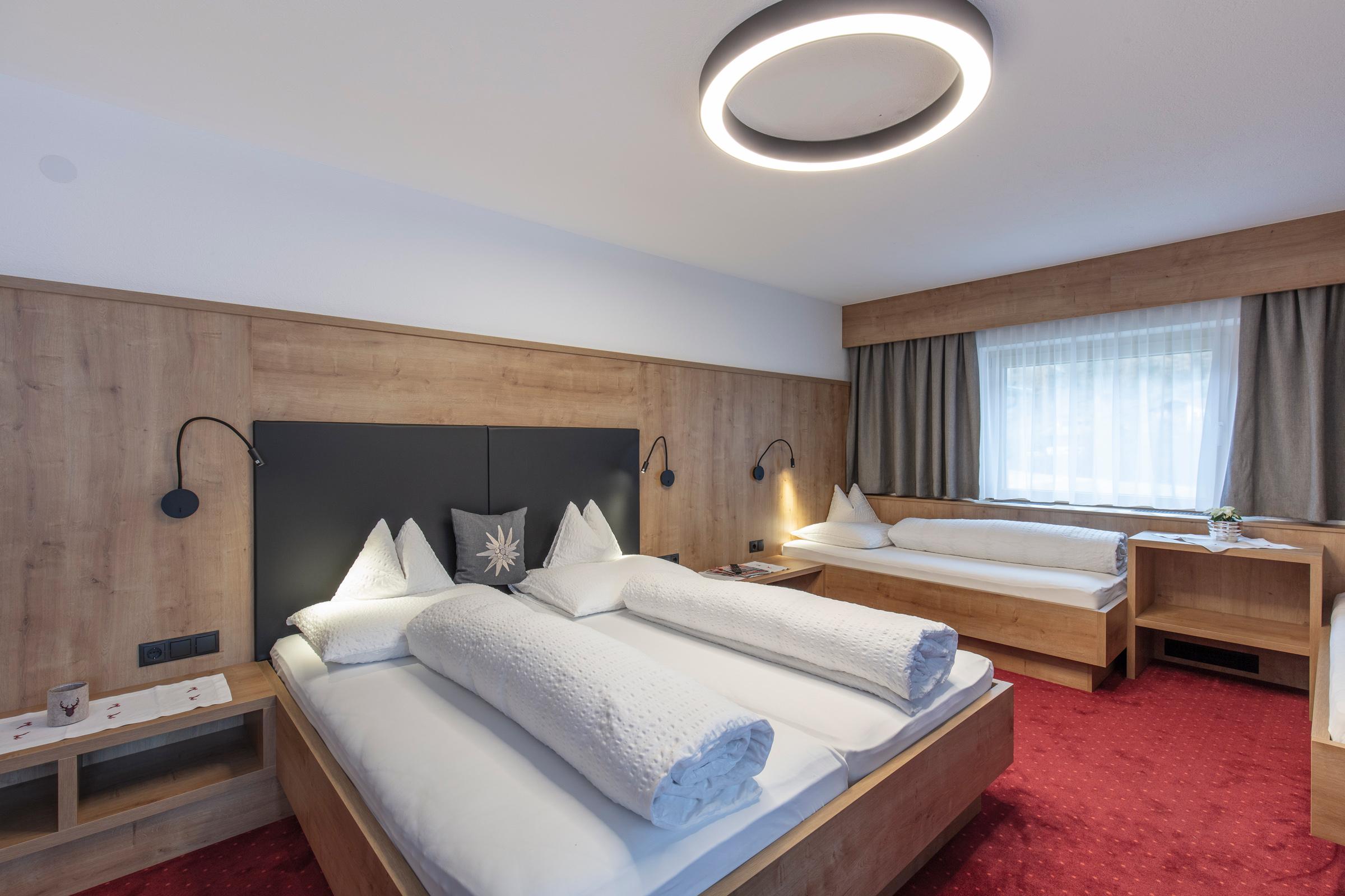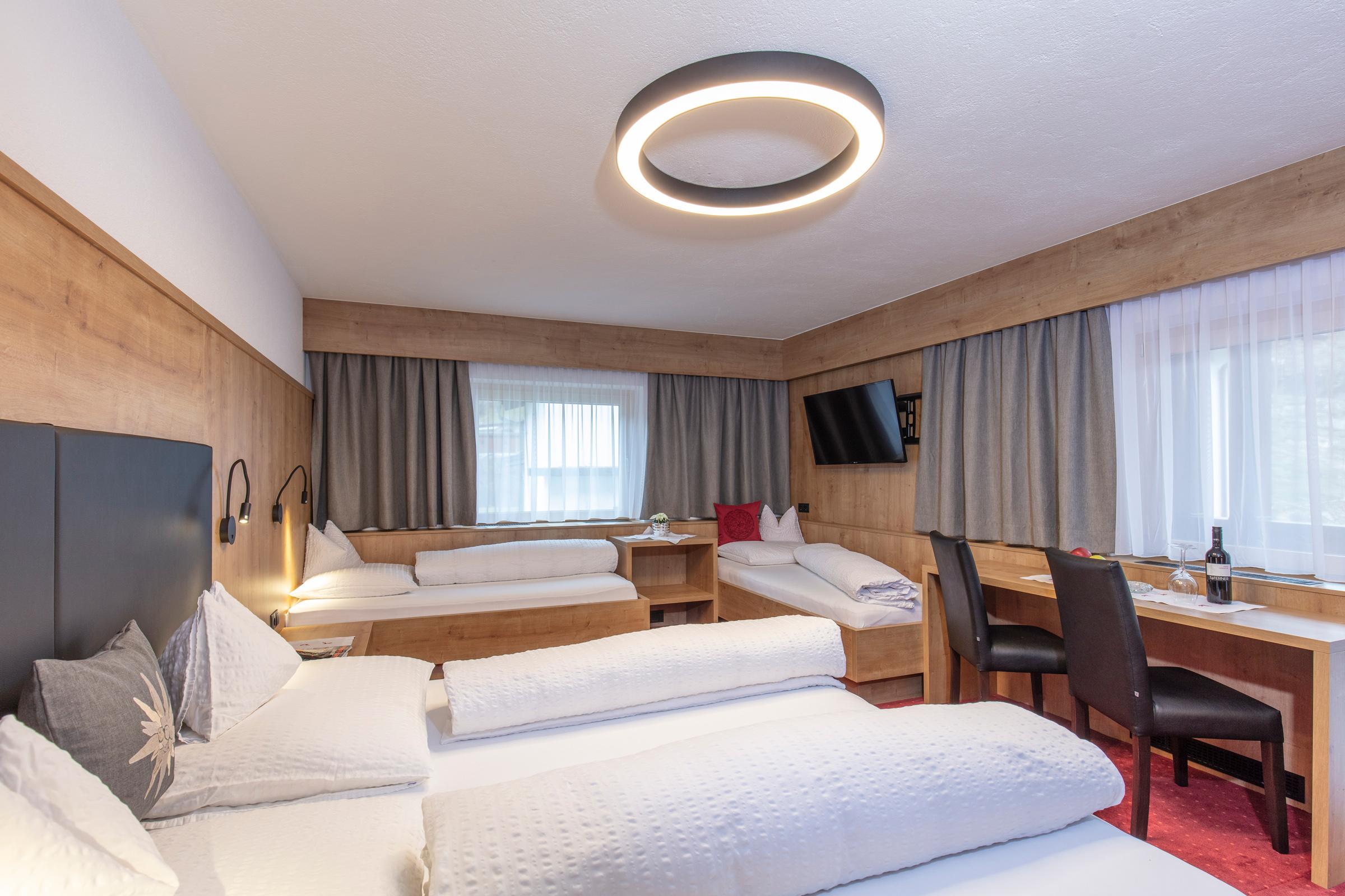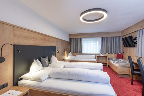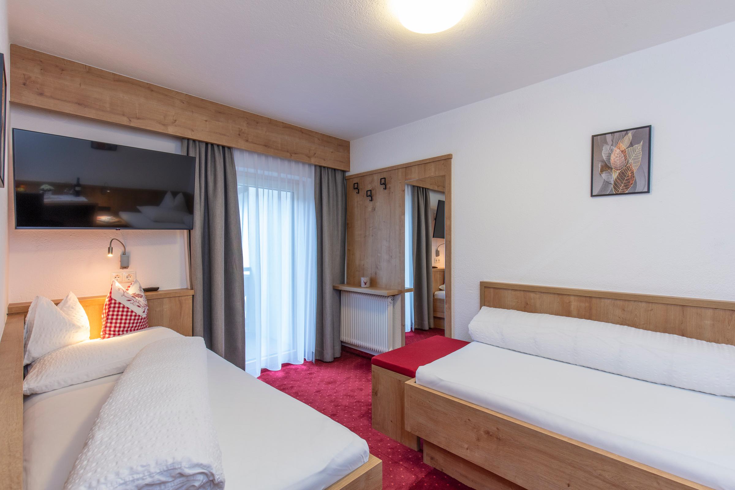 Großes Dreibettzimmer mit Zusatzbett, welches ideal für Familien geeignet ist. Das Zimmer ist ausgestattet mit Dusche/WC, Telefon, Flat-TV, Tresor, Schreibtisch, W-LAN sowie einem Balkon. Ein reichhaltiges Frühstücksbuffet mit unseren hofeigenen Produkten ist inkludiert. Größe ca. 26 m².
