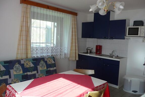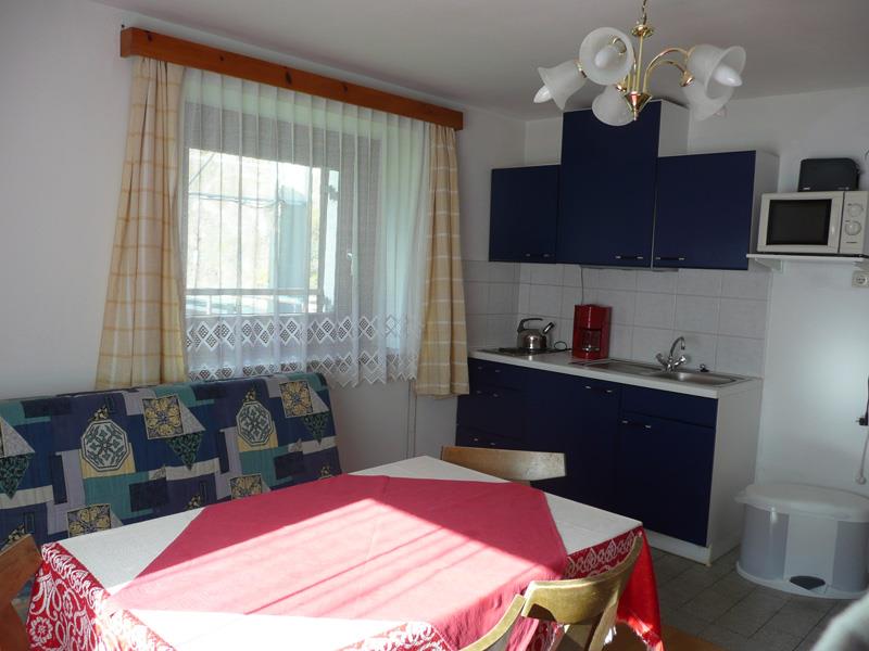 Die Wohnung befindet sich im Erdgeschoss und ist ca. 66 m² groß, besteht aus 2 separaten Schlafzimmern (Dreibettzimmer), 1xBadezimmer (Dusche-WC), Vorraum und Wohn-Schlafküche (ausziehbare Couch für 2 Pers.) mit einem Küchenblock (4-er Cerankochfeld), Minibackofen, Mikrowelle, Dunstabzug, Kühlschrank und Geschirrspüler; Sat-TV. Auf Wunsch Brötchenservice. Frühstück auf Anfrage € 8.- pro Tag/Pers.