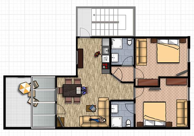 Geräumiges und großzügiges Appartement im 3. Obergeschoß mit Dachterrasse und Panoramablick; 2 Doppelzimmer mit Schlafsofa (jeweils Dusche/WC), Digital-Kabel-TV in allen Räumen. Eine vollausgestattete Küche, großer Wohnraum mit Sitzecke, Sofa und Kabel TV. Größe: ca. 85 m²