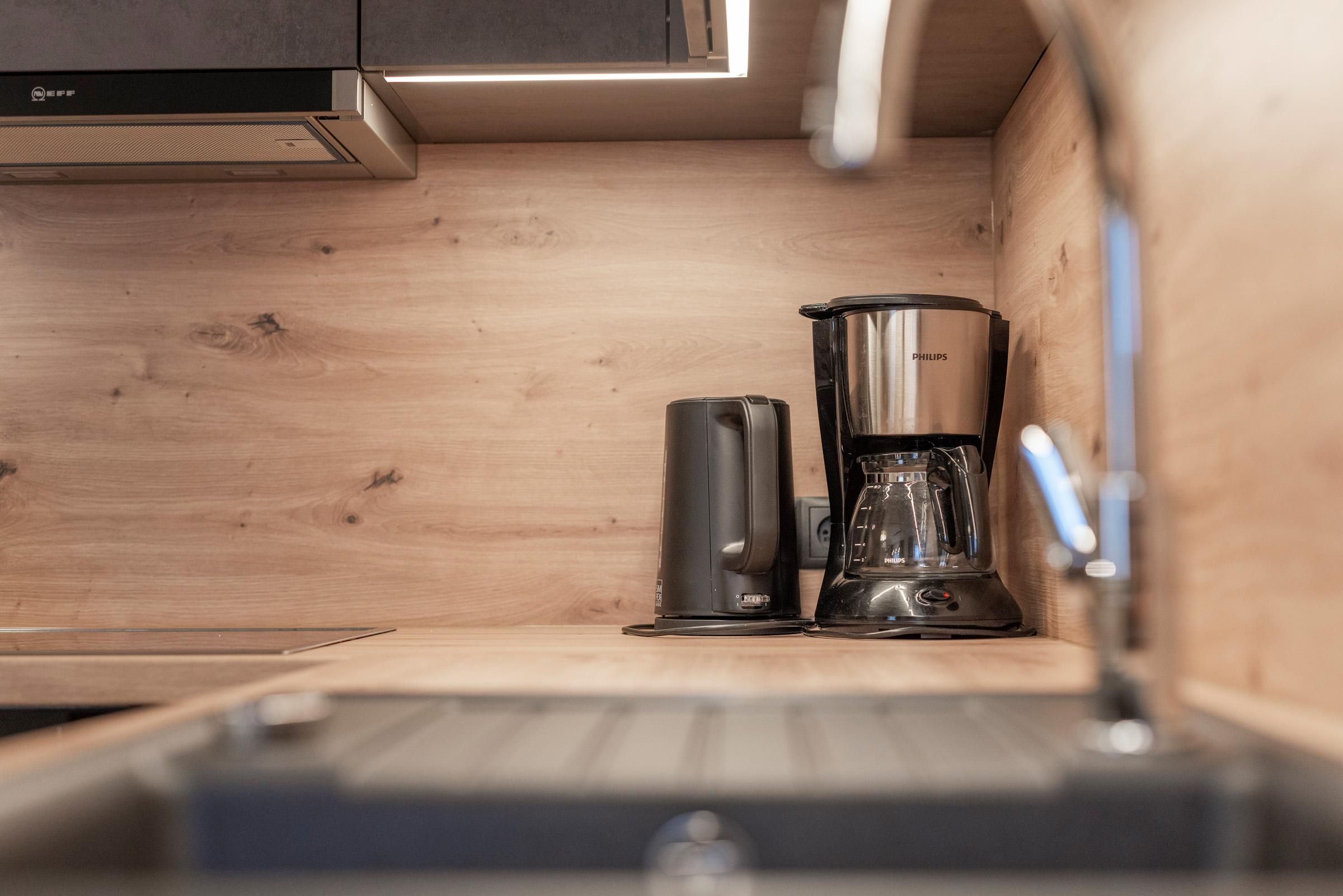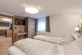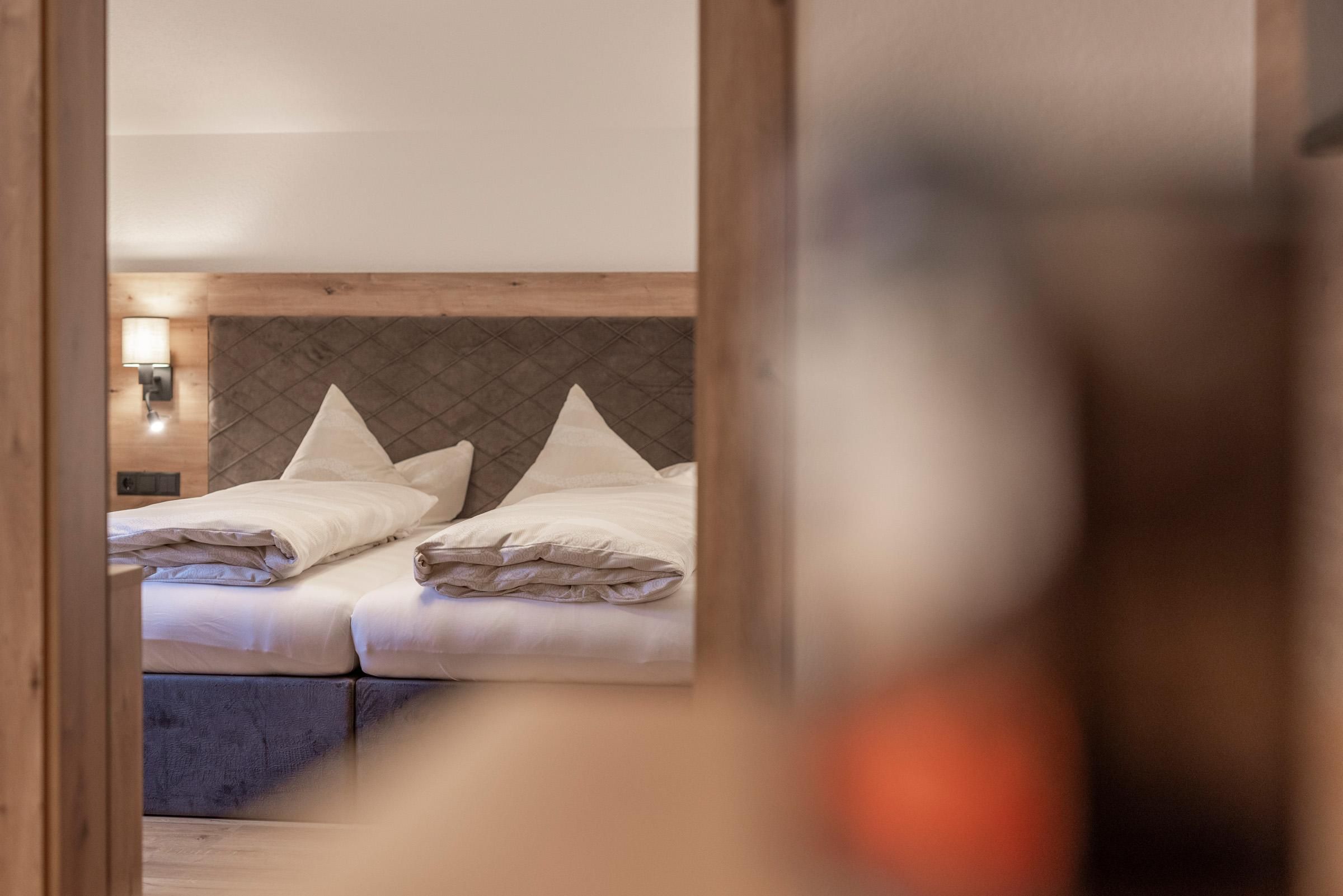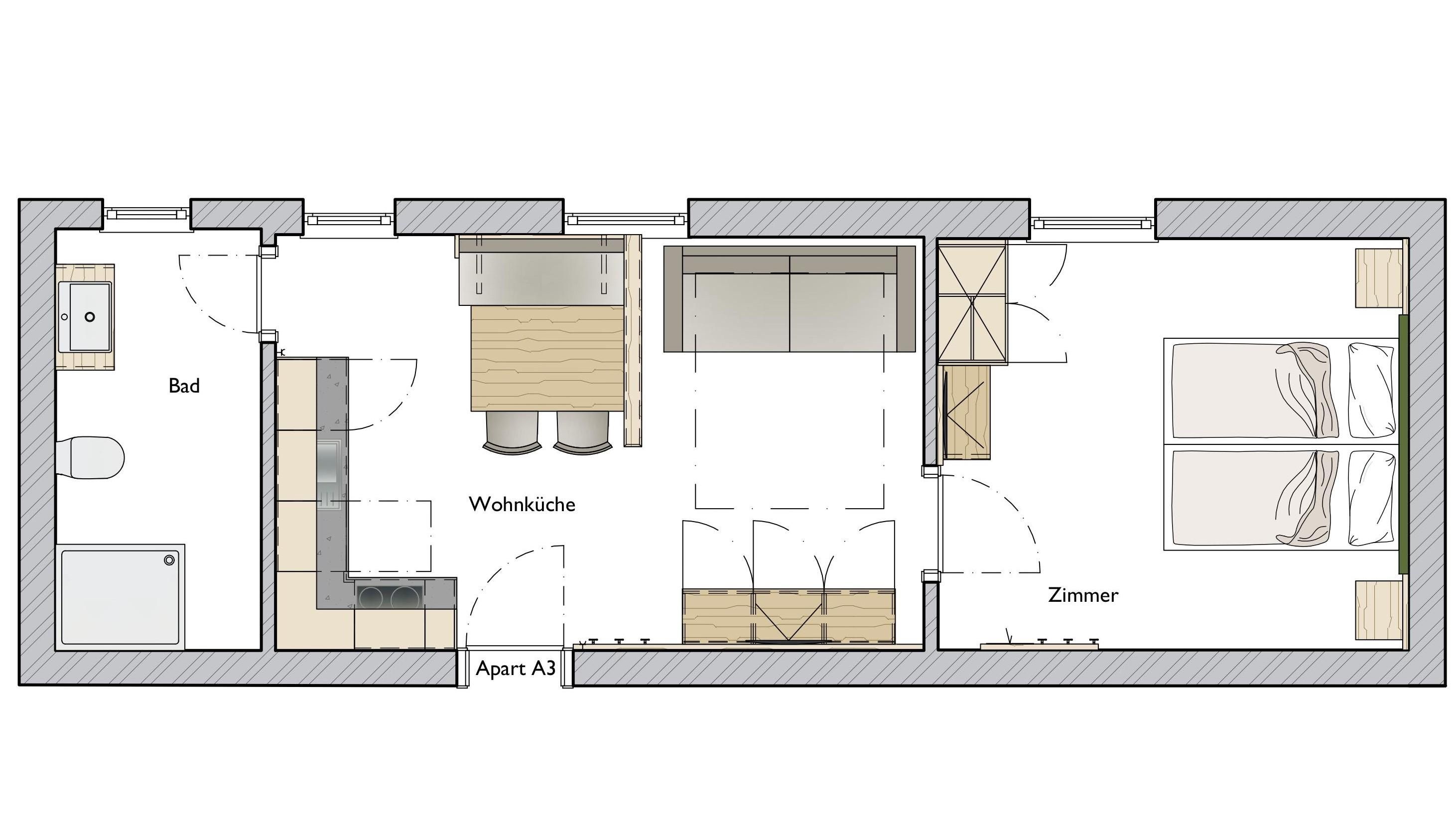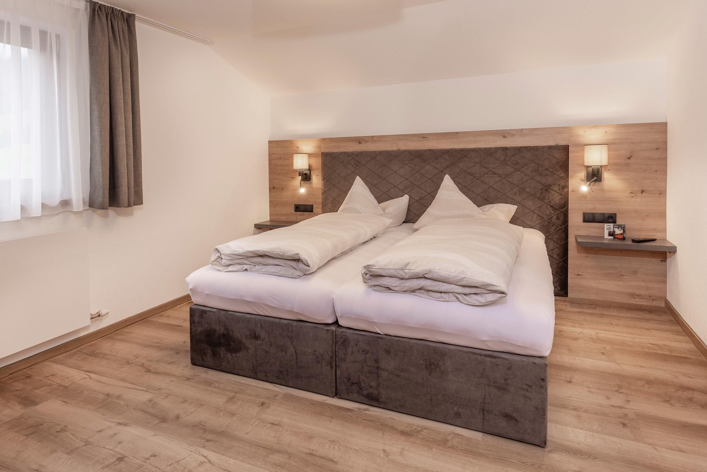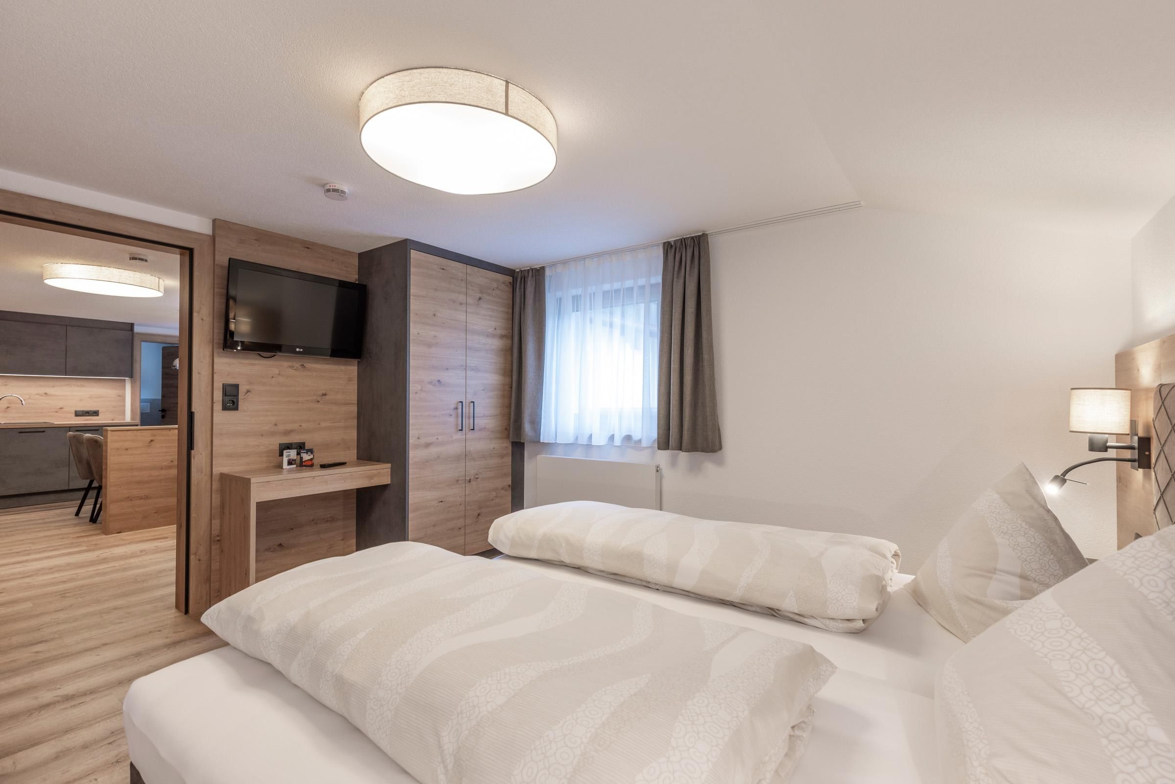 Das neu renovierte Appartement im Jägerhof bietet mit ca. 50 m² besonders viel Platz für entspanntes Wohnen. Im separaten Schlafzimmer sorgen hochwertige Boxspringbetten für erholsamen Schlaf. Die großzügige Wohnküche ist voll ausgestattet und verfügt über einen gemütlichen Essbereich sowie ein ausziehbares Schlafsofa – ideal als zusätzliche Schlafmöglichkeit für 2 weitere Personen. Zwei Kabel-Flat-TVs in Wohn- und Schlafbereich sowie ein Zimmersafe sorgen für modernen Komfort. Das Badezimmer ist mit Dusche und WC ausgestattet. Eine stilvolle Rückzugsoase für Gäste, die gerne mehr Raum und Wohnqualität genießen.