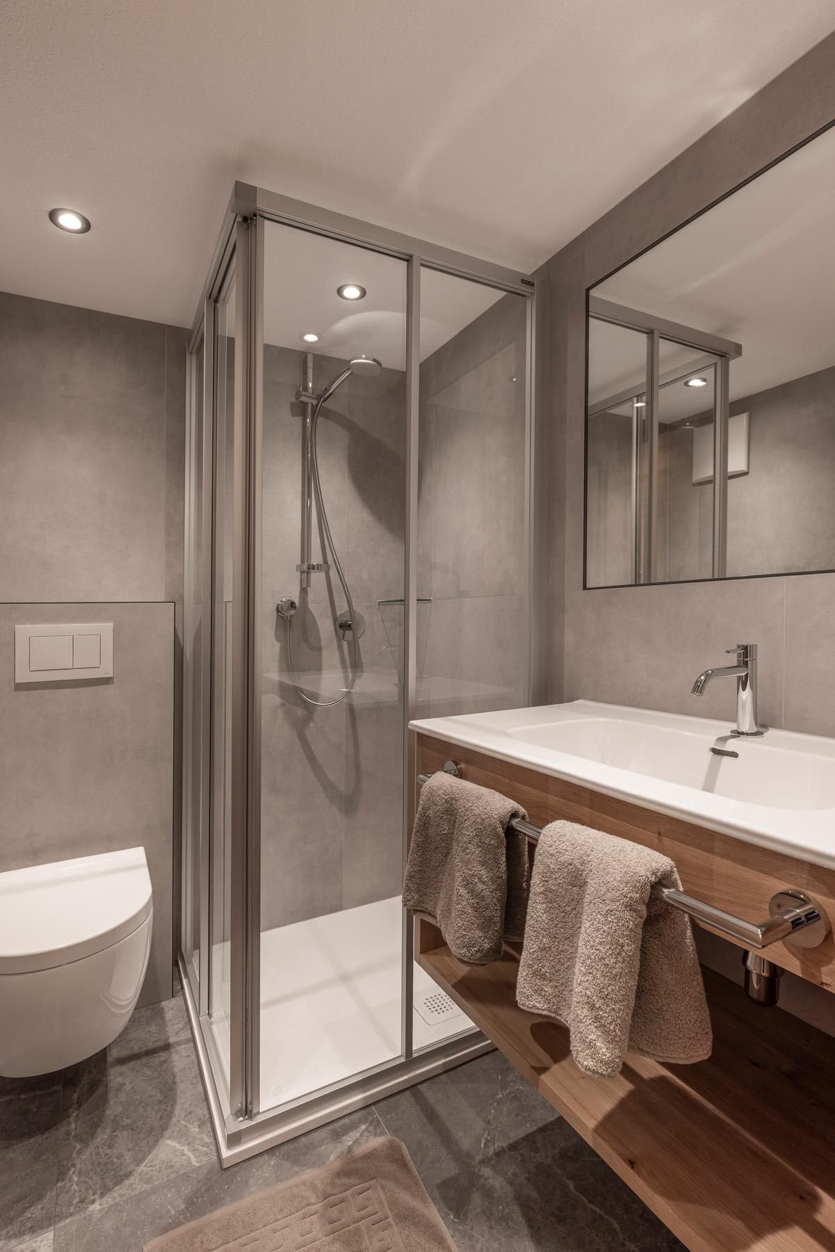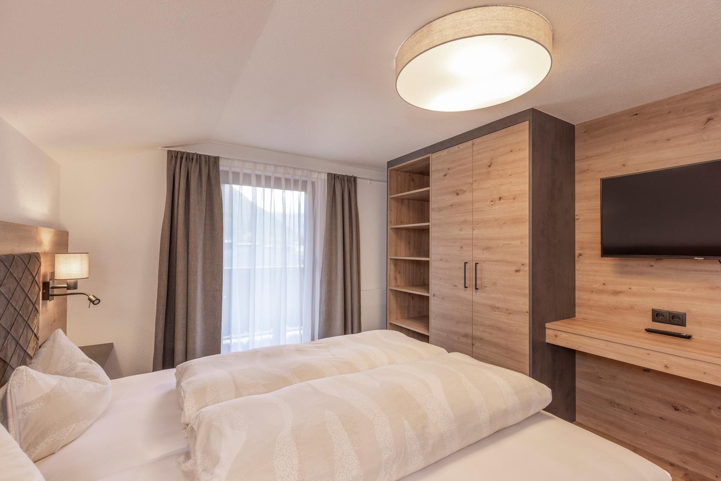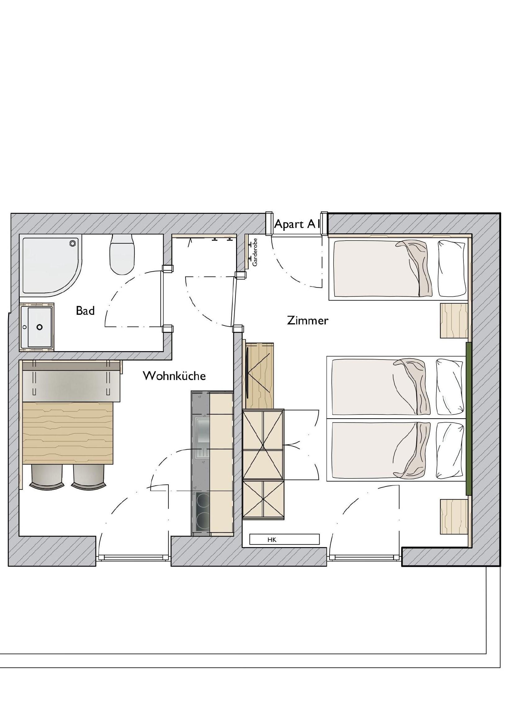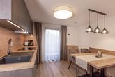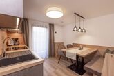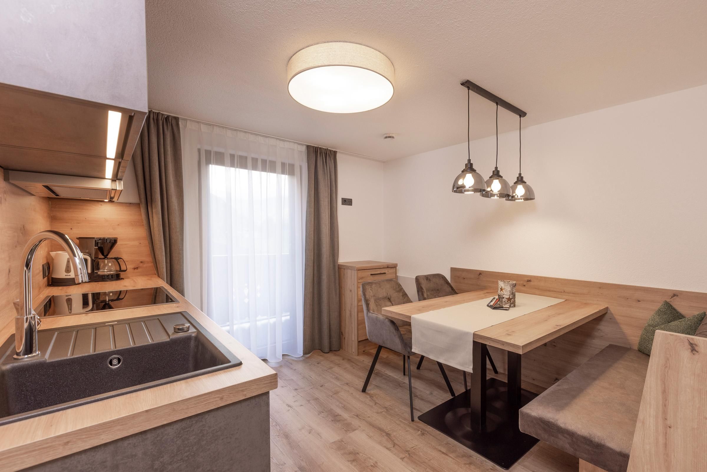 Das kleinste Appartement im Jägerhof präsentiert sich nach der Renovierung modern, stilvoll und bestens ausgestattet – ideal für zwei Personen. Auf ca. 30 m² bietet es alles, was es für einen entspannten Aufenthalt braucht: ein separates Schlafzimmer mit trennbaren Boxspringbetten, ein gemütliches Schlafsofa, Kabel-Flat-TV und ein Zimmersafe. Das moderne Badezimmer ist mit Dusche und WC ausgestattet. Die großzügige Wohnküche mit Essbereich lädt zum Verweilen ein – der Balkon eröffnet zusätzlich schöne Momente an der frischen Luft.