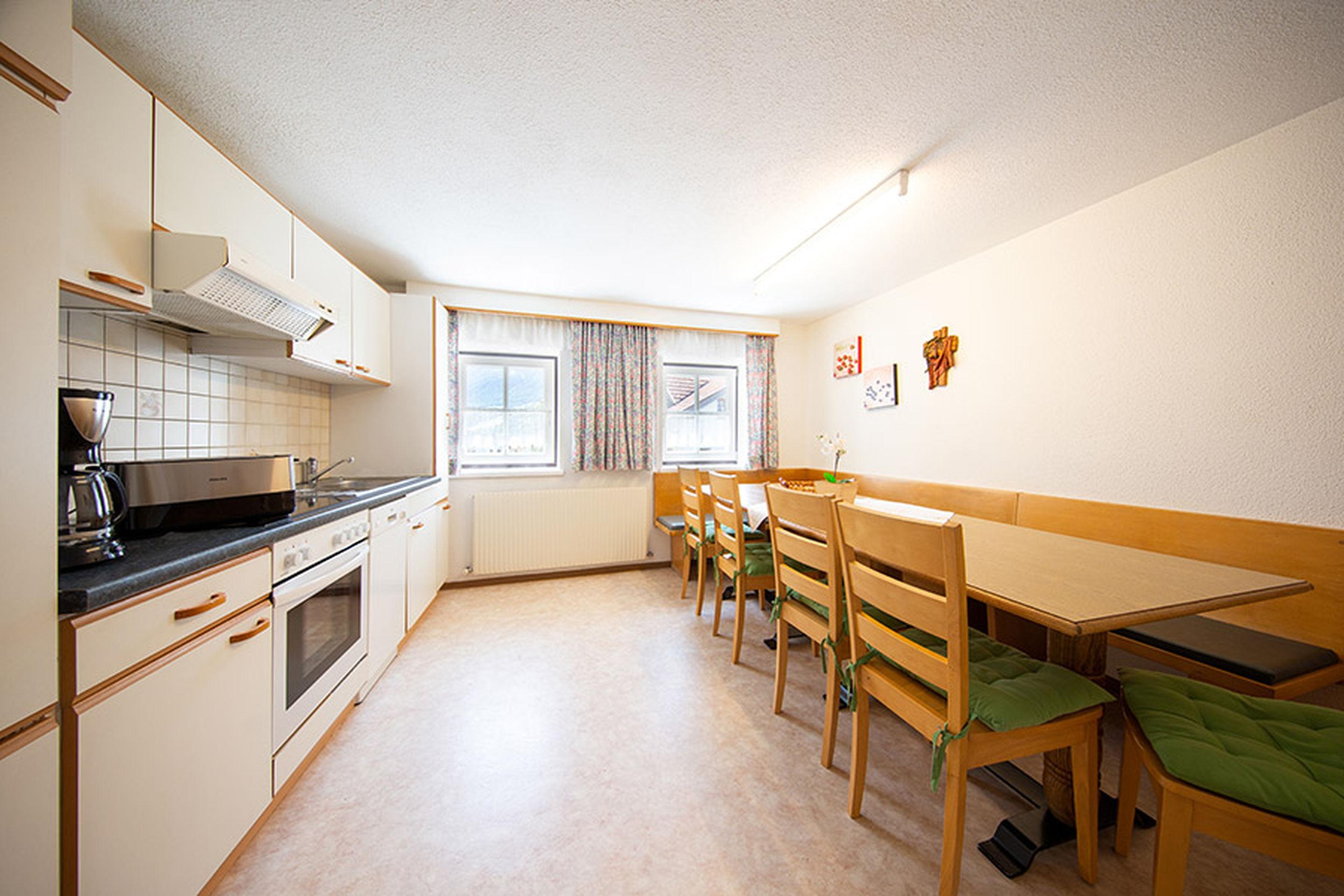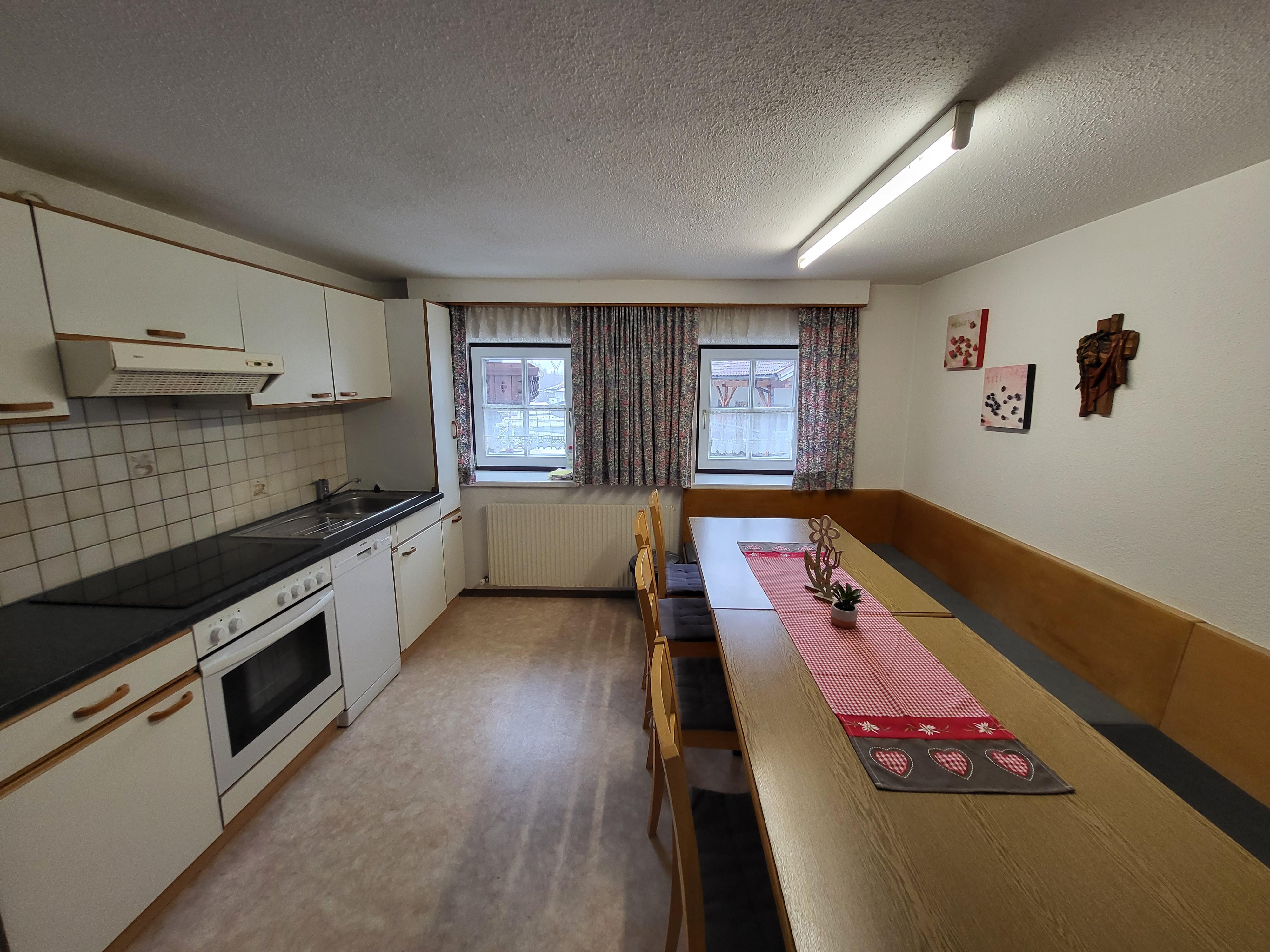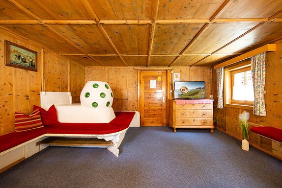 Bauernhaus über 2 Etagen mit ca. 130 m²: 2 Schlafzimmer mit Doppelbett; 2 Schlafzimmer mit Doppelbett und Einzelbett; 2 Badezimmer mit Dusche; 2 separate WC; Wohnstube, aus Zirbelholz getäfelte, mit Kachelofen und eingebauter Essecke; vollausgestattete Küche mit 4 Platten-Herd, Backofen, Mikrowelle, Geschirrspüler, Kühlschrank, Kaffeemaschine, komplette Geschirr- und Kochausstattung sowie Essbereich; möblierte Terrasse und kleiner Garten.