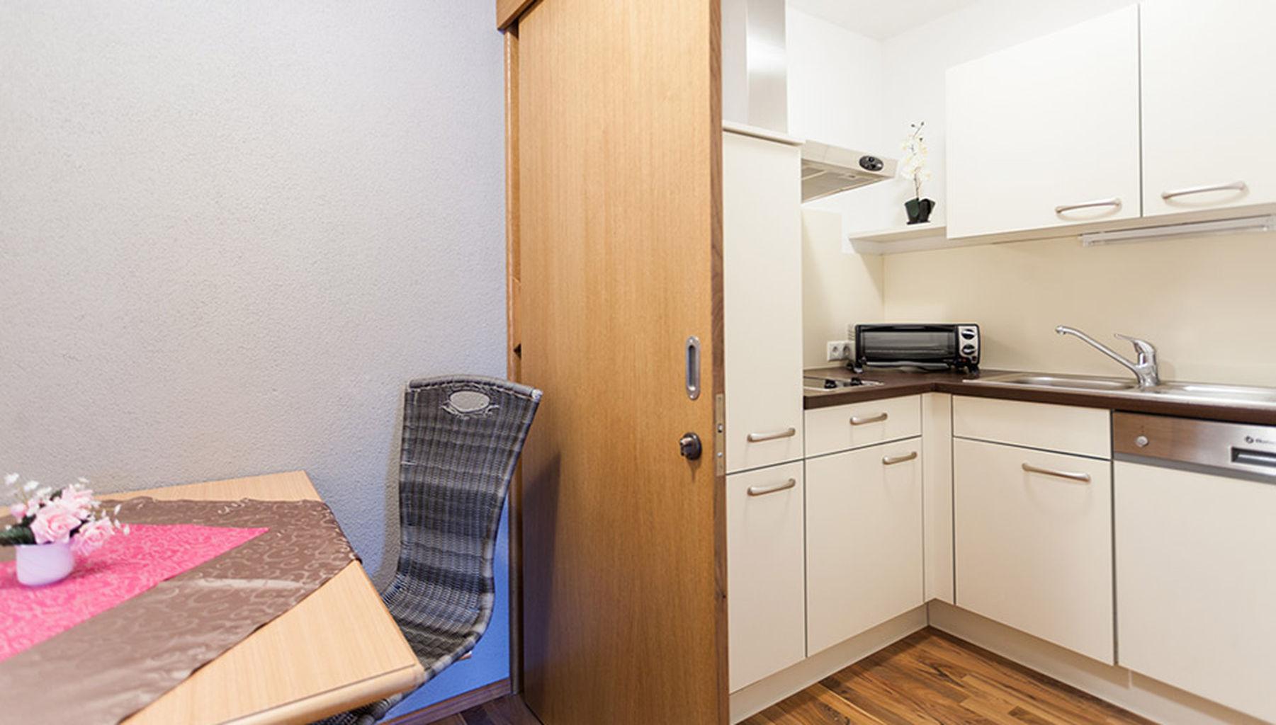 Gemütliches Appartement für 2 Personen mit ca. 22 m²: 1 Doppelzimmer; 1 Dusche/WC mit Haarföhn; 1 Wohnküche mit Küchenblock, Essecke, Kühlschrank, Geschirrspüler, Kaffeemaschine, 4-Platten-Cerankochfeld uvm....