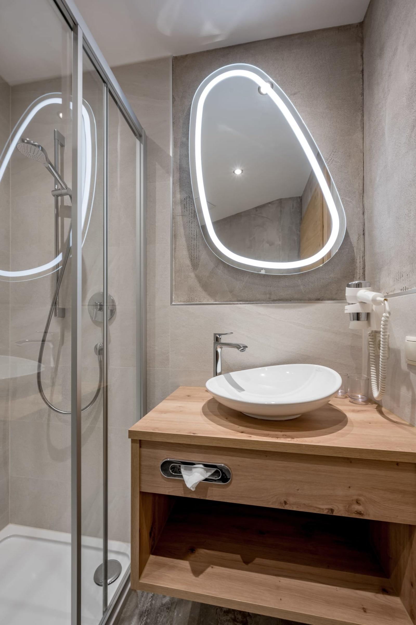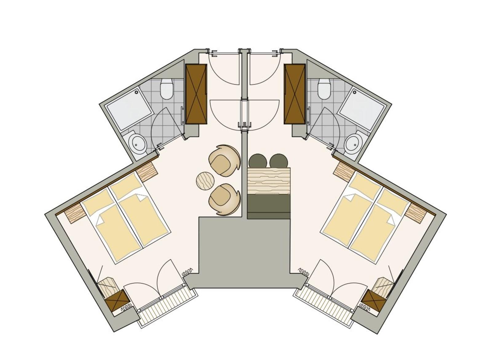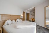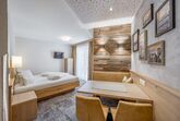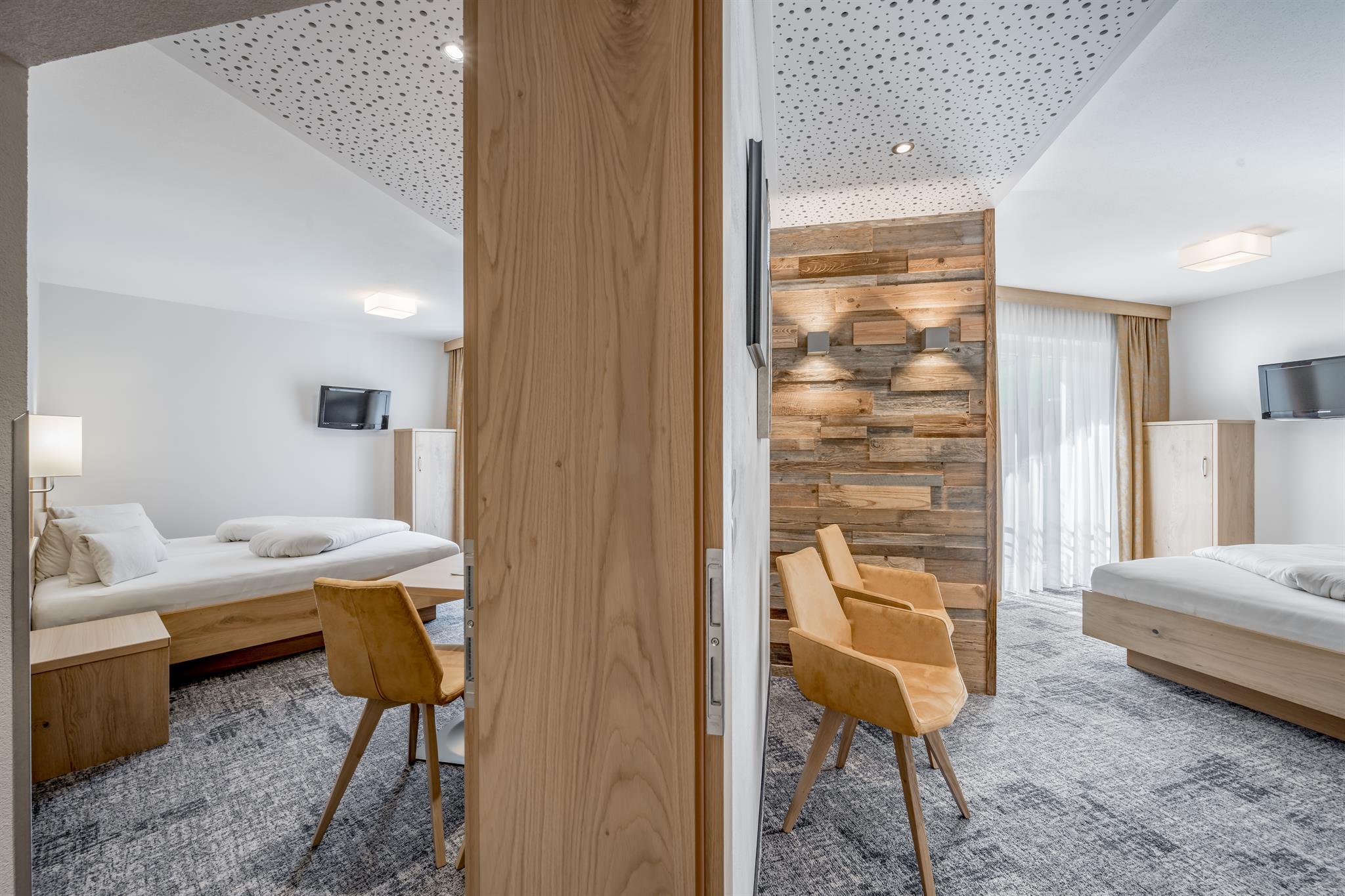NEU - exklusive Suite (50m²) im modernen alpinen Stil mit zwei separaten Schlafzimmern (Verbindungstüre) jedes Zimmer mit DU/WC, Fön, beheizter Handtuchhalter, Safe, Flat-TV, gratis WLAN, gemütlichen Sitzbereich, jeweils kleinen franz. Balkonvorsprung mit traumhaftem Panorama Bergblick, Vorraum/Schrankraum;