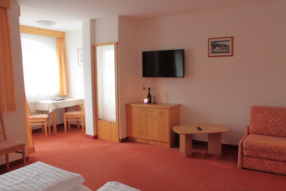 Doppelzimmer Superior mit Balkon, Doppelbett und Schlafsofa für eine 3. Person, Sitzecke im Erker. Badezimmer mit Dusche/WC und Haarföhn. Kabel-TV, Telefon, Safe und Wasserkocher und Gläser. Größe ca. 33 m²